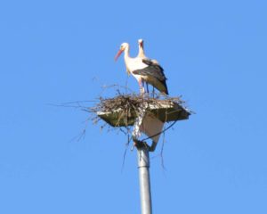 Gefiederte Gäste. Ein Storchenpaar hat einen Flutlichtmasten des neuen Unterentersbacher Kunstrasenplatzes als Brutstätte ausgewählt. Zell-Unterentersbach