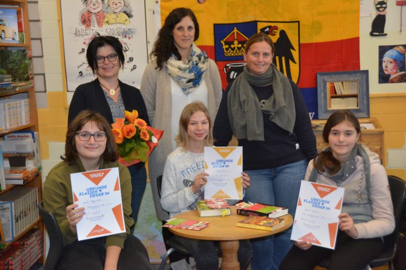Für das am Nikolaustag ausgetragene Finale in der Schülerbücherei hatten sich auch die Klassensiegerinnen Sarah Hogenmüller (R6a) und Jasmin Braun (R6b) qualifiziert. Während Sarah einen spannenden Auszug aus Vanessa Walders »Das wilde Määh« vorlas – ein Buch über einen kleinen Wolf als Außenseiter –, führte Jasmins Vortrag in das Nobelinternat »Cornwall College«, wo die Protagonistin mit der Frage konfrontiert wird: Wem kann Cara noch trauen? In Fionas Auswahllektüre, die eine gelungene Mischung aus Abenteuer und zeitgeschichtlichen Elementen bietet, kommen die Kinder Leo und Imke dem Geheimnis eines alten Hauses auf die Spur. Fiona gelang es dabei, die besondere Atmosphäre des Textes ansprechend zu gestalten.