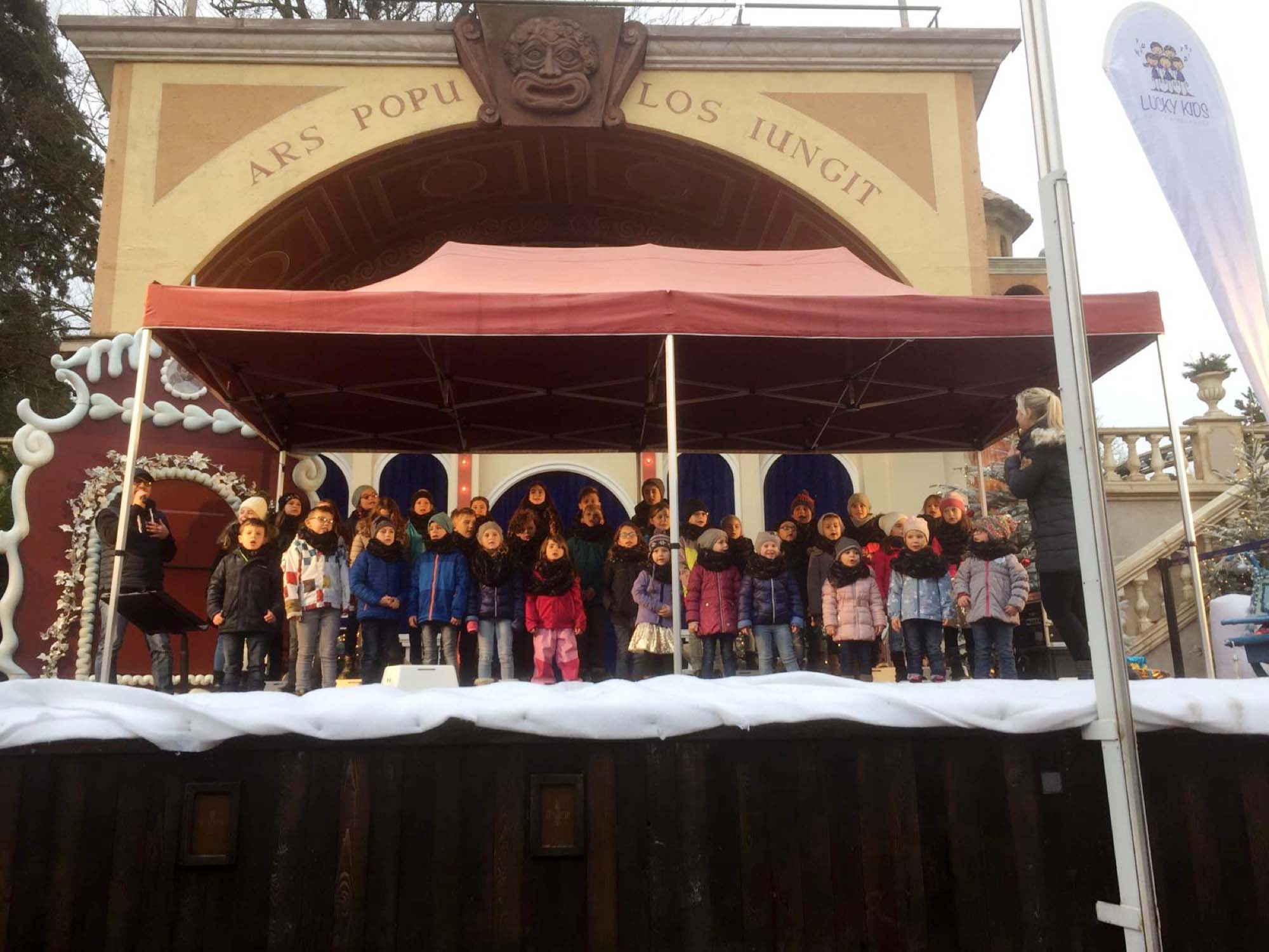 Auf der wunderschönen winterlich und weihnachtlich geschmückten Bühne im italienischen Viertel begeisterten die Kinder im Alter von 4 bis 13 Jahren mit einem Strauß der schönsten Winter- und Weihnachtslieder die Besucher im Park. Sie alle wurden von der Fröhlichkeit angesteckt, klatschten und sangen mit. Trotz des regnerischen Wetters blieben viele Parkbesucher stehen, hörten zu und genossen das Konzert. Die Lucky Kids standen wie kleine Profis auf der Bühne. Die anfängliche Nervosität war schnell verflogen. Sie alle strahlten beim Singen, tanzten mit, klatschten mit und waren sichtlich stolz, dass sie hier vor großer Kulisse auftreten durften. Selbst die kleinsten 4-Jährigen zeigten eine hohe Ausdauer bis zum Schluss des Programms.