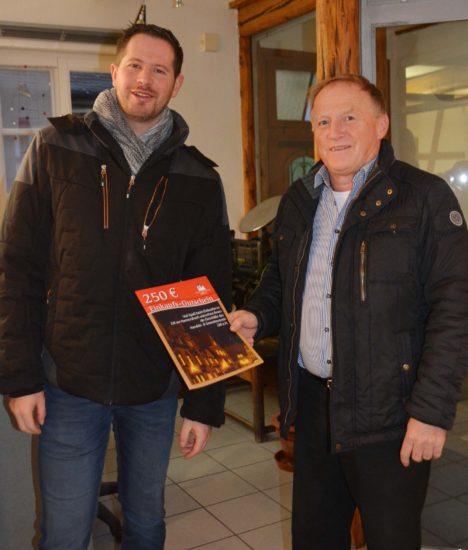 Beim Weihnachtsgewinnspiel des Handels- und Gewerbevereins hat Marco Bürkle (links) am zweiten Adventssamstag den Hauptpreis gewonnen. Nach einem feinen Essen im Hotel Klosterbräustuben hat er das Los ausgefüllt, das ihm nun einen Einkaufsgutschein im Wert von 250 Euro beschert hat. Hotelier Paul Lehmann (rechts), der auch 1. Vorsitzender des HGV ist, überreichte den Gutschein und bedankte sich für die Treue zur Einkaufsstadt Zell. Das nächste feine Familienmenü ist bei der Familie Bürkle jedenfalls gesichert.