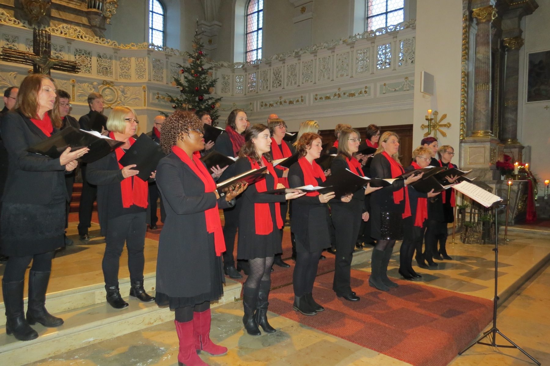 Der Joy & Fun- Chorus unter Leitung von Wolfram Dreher sang eine halbe Stunde vor Beginn der Christmette zur Einstimmung. Mit dem Lied »Stille Nacht, heilige Nacht« eröffnete der Chor sein Repertoire. Die erste Strophe wurde in der englischen Version gesungen, danach eine Strophe auf Deutsch und zur dritten Strophe wurden die Besucher zum Mitsingen eingeladen. Gerne folgte die Gemeinde dieser Einladung.