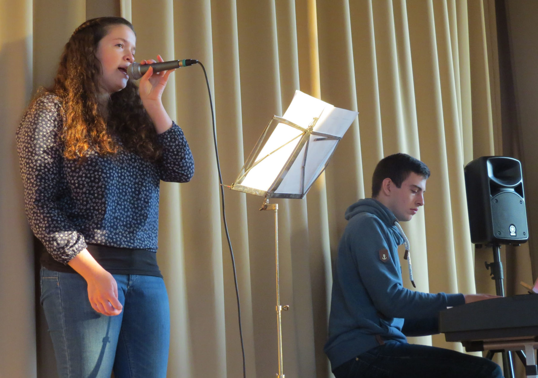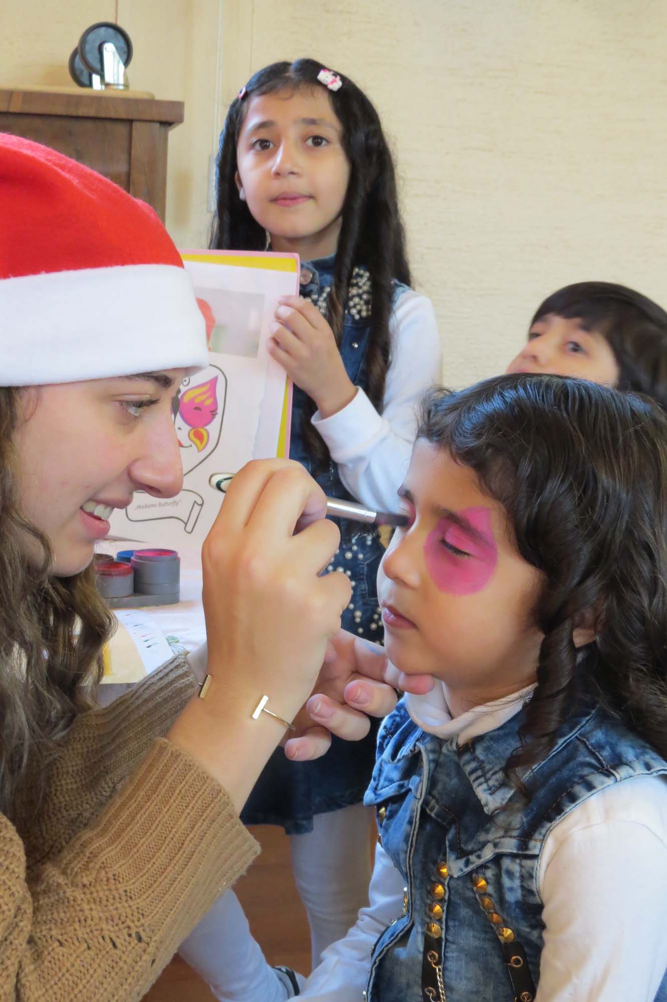 Für das Küchenbuffet brachten die Flüchtlingsfrauen auch traditionelle Gerichte aus ihrer Heimat mit, die zu einem abwechslungsreichen Angebot führten. Zur Unterhaltung der Gäste musizierten zuerst Vanessa Lehmann (Gesang) und Philipp Rendler (Klavier). Sie erhielten viel Applaus für ihre schöne Musik. Der Tisch mit dem Kinderschminken war den ganzen Nachmittag umlagert von Kindern. Jasmina El Alaoui, Carmen Stötzel und Rebecca Metz verschönerten ihre Gesichter mit bunten Motiven.