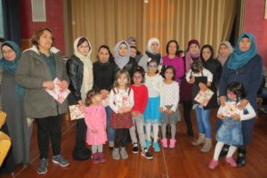 Gisela und Karl-Heinz Hug sangen traditionelle deutsche Weihnachtslieder, die vom Publikum dank Liedblätter sogar mitgesungen werden konnten. Die Kinder durften mit Percussion Instrumenten ihren Teil zur Musik beitragen. Höhepunkt und Abschluss des Nachmittags ist die Bescherung der Kinder mit den gespendeten Geschenken: Jedes Kind durfte eine schöne Tüte in Empfang nehmen und jede Familie erhielt einen Gutschein von den Frauen der Kleiderkammer. Flüchtlingsfrau Djamilya Vagaeva aus Russland kümmerte sich um die Verteilung der Geschenke.