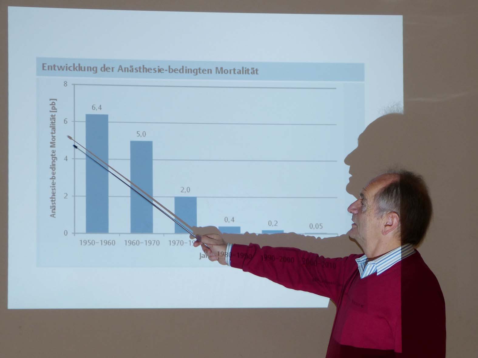 Heinz Burger informierte über Geschichtliches, die Entwicklung verschiedener Narkoseverfahren und Komplikations­möglich­keiten.