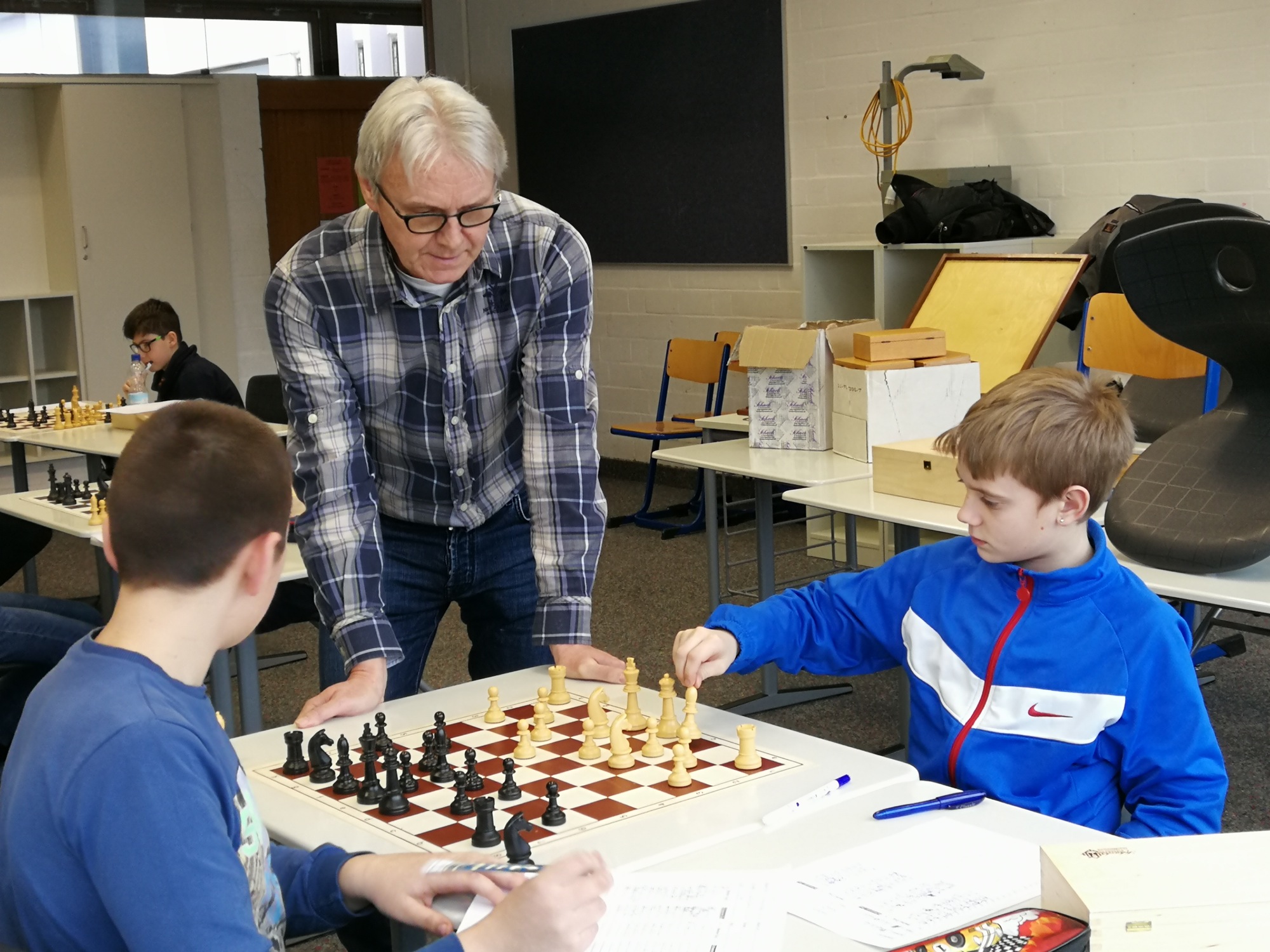 Zwölf Teilnehmer aus den Klassen 4 bis 7 machen sich am Mittwochnachmittag zwei Stunden lang mit Grundkenntnissen des Schachspiels vertraut. Auf dem Spielbrett und mit Arbeitsblättern trainieren die Übungsleiter Thomas Groh, Wolfgang Niederberger und Thomas Gißler das altersgemäße Einfühlungsvermögen ihrer jungen Schützlinge. In den Übungen zur Taktik erfahren die Schüler eine gezielte Hinführung zum systematischen Denken. Dass man danach mit einem Partner auf ähnlichem Niveau die Spielzüge erproben kann, gefällt Max-Jörn aus der R6b besonders gut.