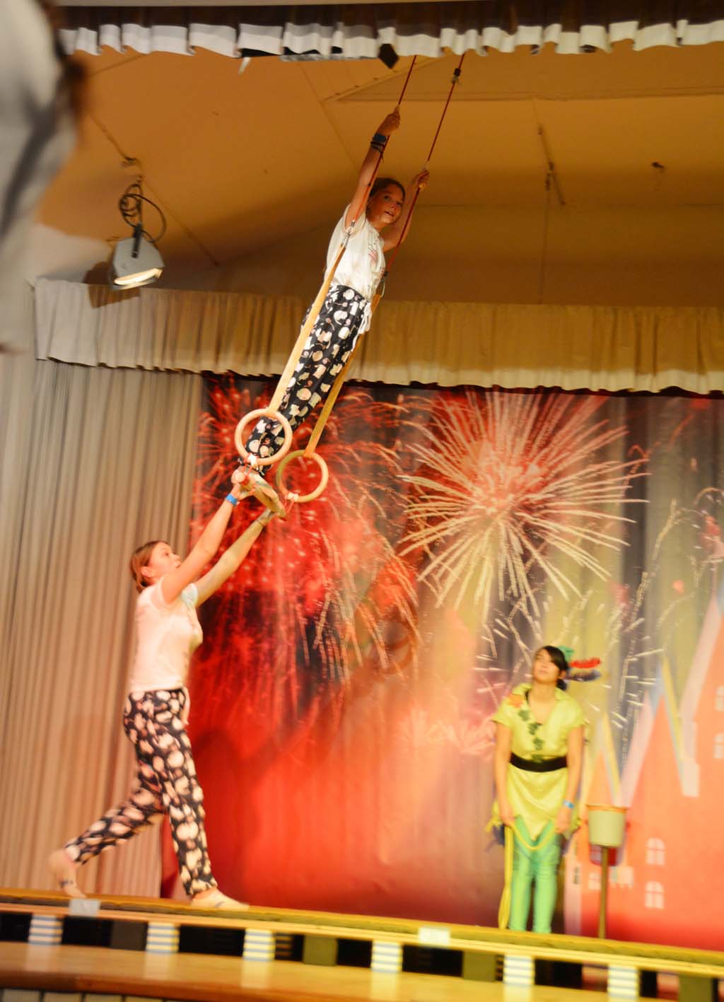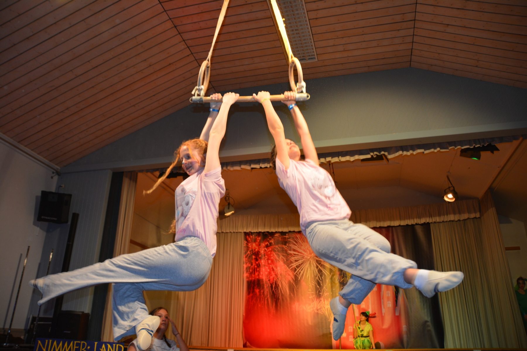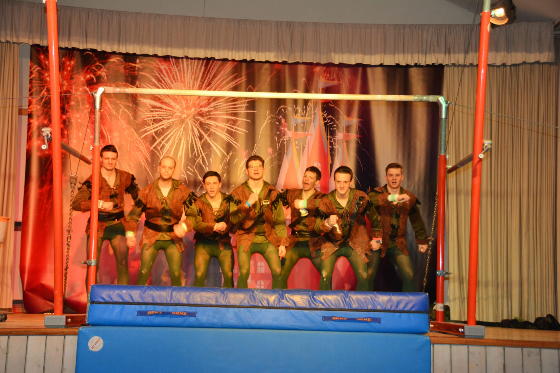 Anmutig schwebten hübsche Tinkerbells in ihren grünen Tüllröckchen durch das Kinderzimmer und erweckten dort die Mädels aus ihren Träumen. Gemeinsam wirbelten die Leistungsturnerinnen des TV Zell über den Schwingboden im Nimmerland und schwangen sich mutig an der schwebenden Reckstange über die Köpfe des Narrenvolkes in der Jahnturnhalle.