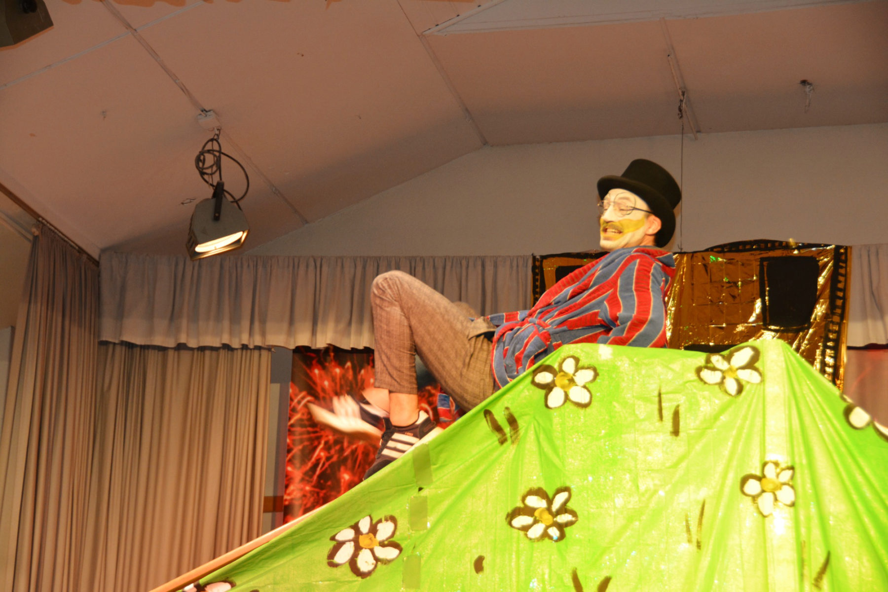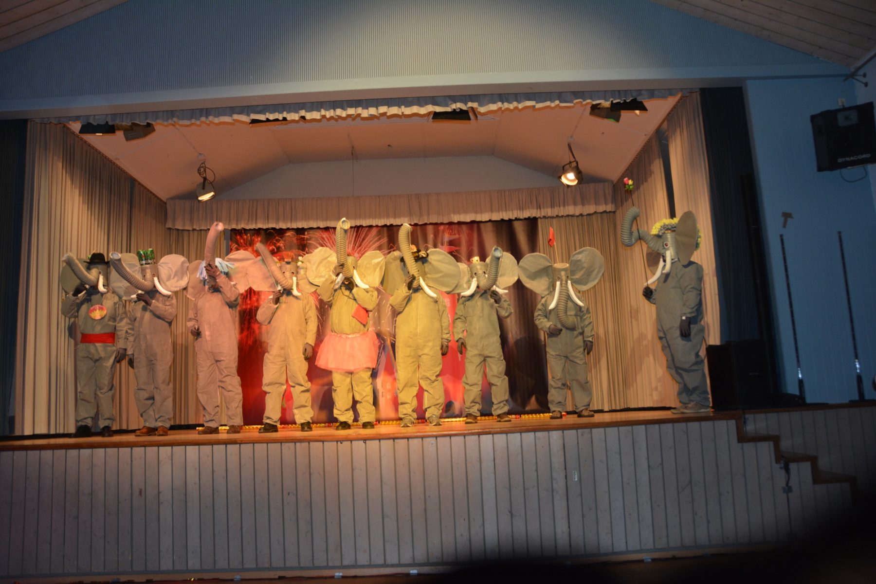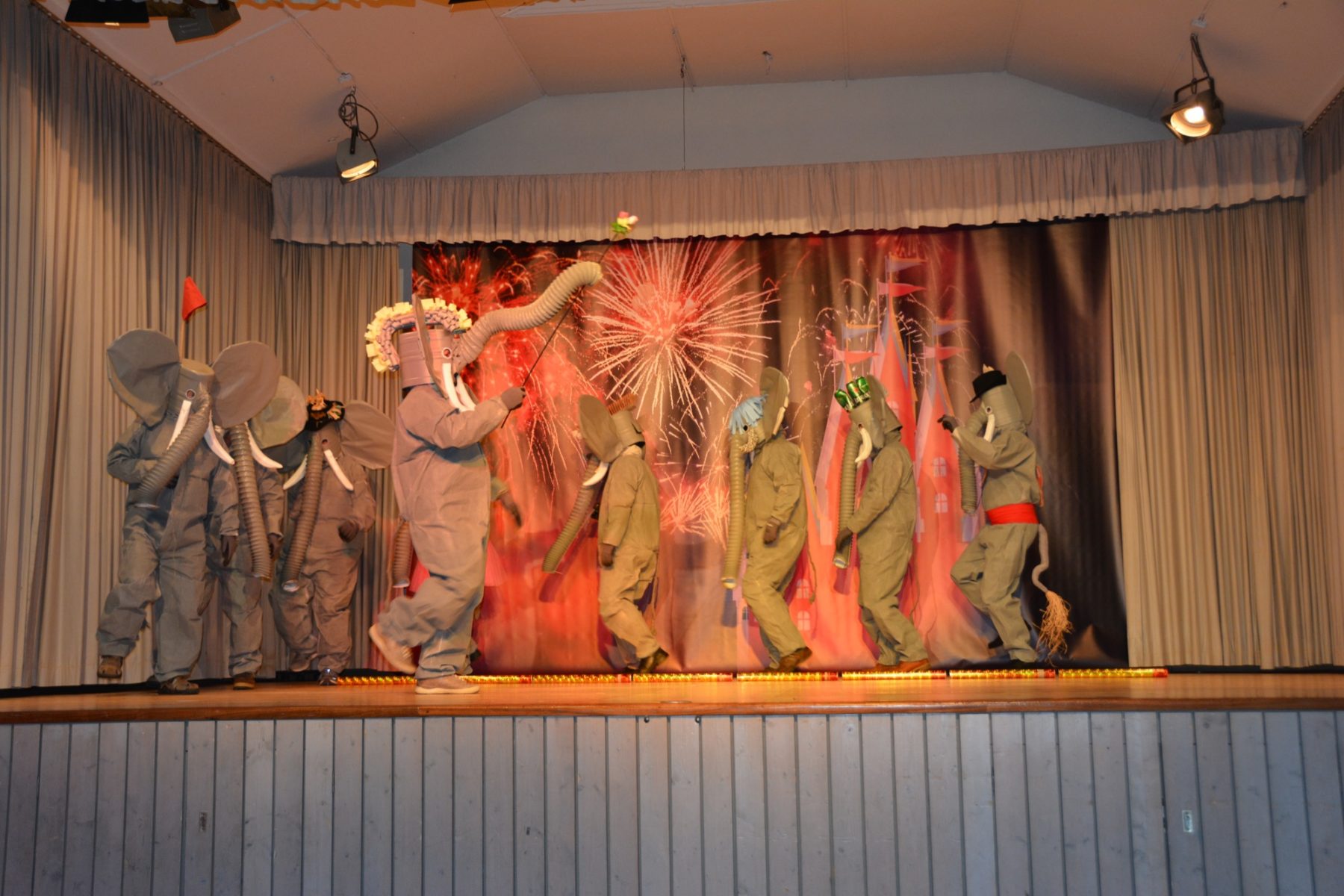 Und schon stampfte die Elefanten-Patrouille angeführt von Oberst Hathi durch den Turnerball-Dschungel. Bei Parade zu Ehren der wackeren Freitagsabendmänner waren Ähnlichkeiten mit Zeller Bürgerwehr-Aufmärschen nicht zufällig – einziger Unterschied: die Quoten-Elefantin im rosa Tüllröckchen. Der Knaller war die finale Abgas-Kontrolle, bei der bunte Papierkonfettis auf die Zuschauer herabregneten. Die Kostüme der Männerriege waren sehenswert. Das mit dem Gleichschritt trainieren wir nächsten Freitag nochmals…