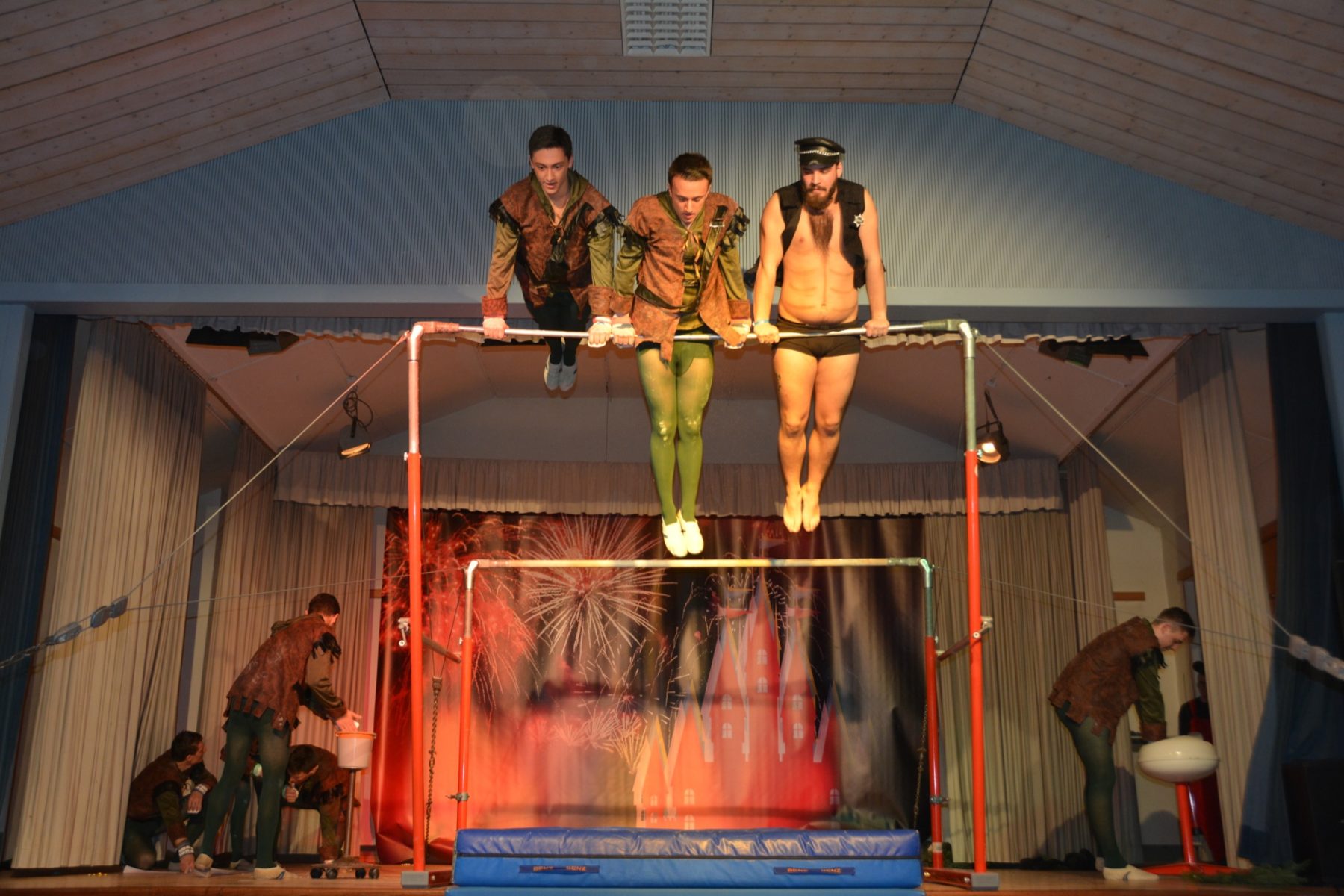 Im Unterholz vom Blackwood-Forest lauerten Robin Hood und seine Räuber. Die hielten nicht nur den Zeremonien-Meister in seiner knappen Latexshorts in Schach sondern mit einer spektakulären Turnshow am Stufenbarren auch das Narrenvolk in Atem. Den Power-Song »Ich will mit dir fliegen« durfte beim Treiben der Leistungsturner wörtlich genommen werden.