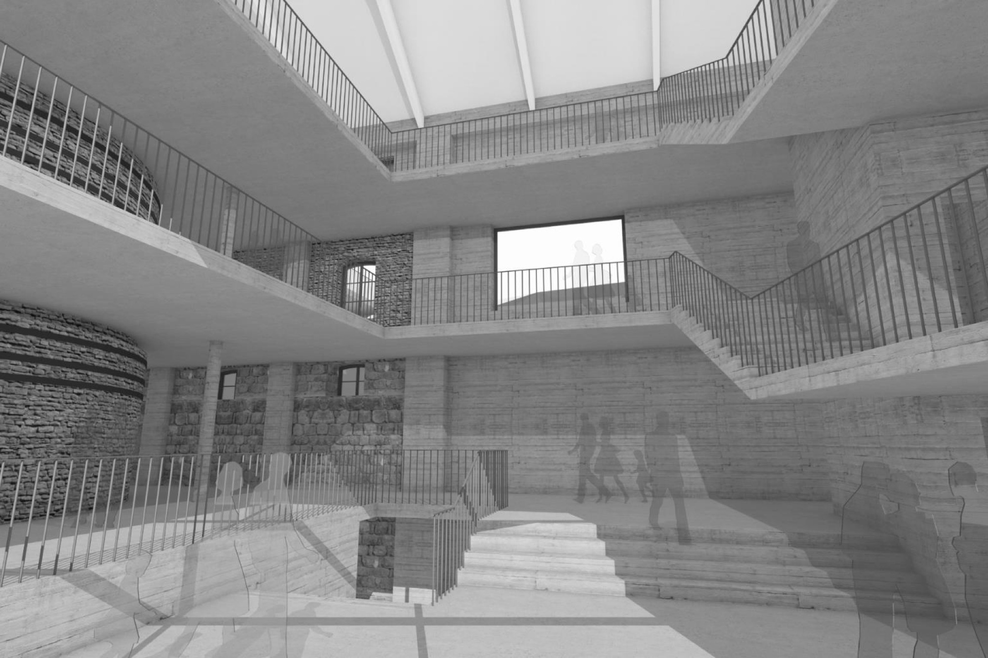 Auch im Innenbereich dominiert die Kombination aus altem Gemäuer und Sichtbeton. Beton wird das Material sein, das den Bodenbelag bildet. Auch Wände und Decken werden in verschiedenen Ausführungen mit diesem Material gestaltet.