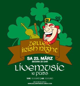 Bereits zum fünften Mal findet sie in Zell a. H. statt: die Zeller Irish Night! Dafür verwandeln sich zwölf Zeller Kneipen für eine Nacht in Irish Pubs – mit allem was dazu gehört: Guinness, Kilkenny, Irish Coffe… und natürlich Livemusik! Los geht’s am Samstag, 23. März, ab 20 Uhr! Dann heißt es irische Lebensfreude live und hautnah genießen.