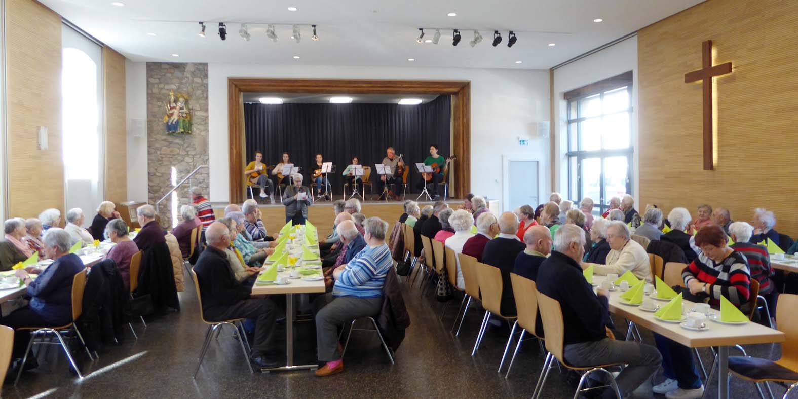 Gestärkt durch Worte im Gottesdienst und der Krankensalbung machten sich die Senioren auf den kurzen Weg ins Pfarrheim. An mit Narzissen geschmückten Tischen Platz genommen, wurden die Seniorinnen und Senioren vom Altenratsteam begrüßt und mit Mandolinen- und Gitarrenklängen auf den gemütlichen Teil des Nachmittags eingestimmt. Bei dem von den sogenannten »Arbeitsbienen« rasch servierten Kaffee und Kuchen wurde reger Gebrauch der gegenseitigen Unterhaltung gemacht.