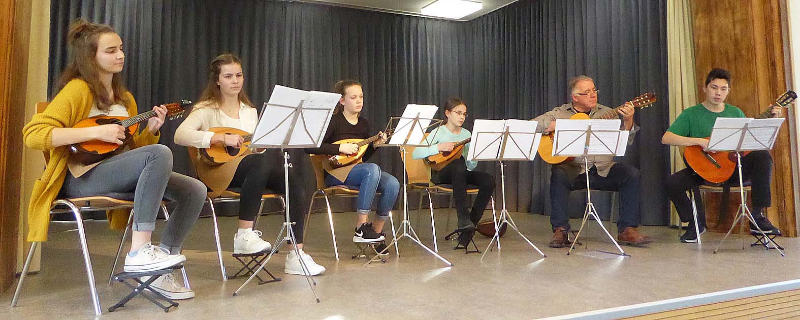Die »Kids« aus Zell und Steinach, Tami Casper, Anne Kasper, Paula Uhl, Pia Moser, Mario Frede vom Mandolinen- und Gitarrenverein Zell a. H. zeigten dann, was sie von ihrem Ausbilder Konrad Vollmer gelernt haben. Auf Mandoline und Gitarre mit ihm zusammen vorgetragen, erlebten die Anwesenden ein abwechslungsreiches, musikalisches Erlebnis von Volksliedern, Schlagern und Musikstücken wie z. B. Ä Burebübli, Schwarzwald-Marie, Ti Amo, Kolo Kalendara, Un Dimanche a Paris, My Heart will go on und Moon light Shadow.