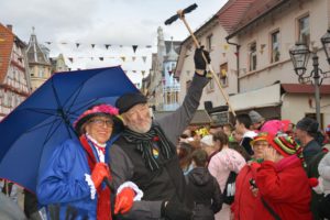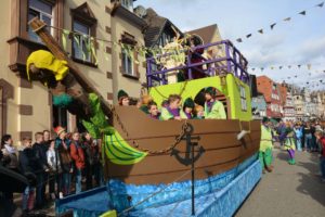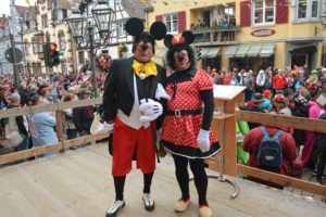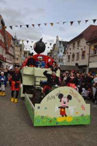 Moderiert wurde der Umzug diesmal von zwei Micky-Mäusen. In den stilechten Kostümen steckten die altbewährten Zunftmitglieder Berthold Damm und Manfred Lehmann. Sie skandierten für die Gäste die traditionellen Fasendsprüchle »Borschdig isch die Sau« und »Fedrig isch ie Henn«. Dann stimmten sie das Publikum auch auf das ausgesuchte Umzugs-Motto ein, das in die Welt der Zeichentrickfilme von Walt Disney entführte.