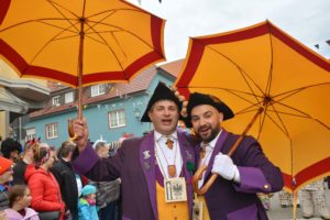 Die Insel-Gemeinschaft hatte sich in Mary Poppins verliebt. Das phantastische Kindermädchen inspirierte die Damen zu eleganten blauen Roben, mit weißen Blusen und roten Accessoires. Echt chic! Die Gegenspieler kleideten sich dagegen als Kaminfeger in tiefstes Schwarz. Kaminfegermeister Olaf Krieg kündigte für die zweite Umzugsrunde eine besondere Attraktion an. Einige verwegene Insulaner stülpten sich dann auf der Bühne mit Ruß gefüllte Säcke über den Kopf und tauchten danach mit rabenschwarzen Visagen wieder auf.
