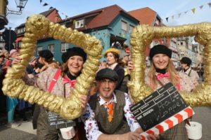 Ein wenig aus der Rolle fielen die Dörfler. Statt sich um die fantastische Welt der Zeichentrickfilme zu kümmern, erinnerten sie an die Anfänge des Films überhaupt. »Als die Bilder laufen lernten« war ihr Thema. Requisiten waren die Film-Kamera und die obligatorische Film-Klappe. Letztere wurde auch Zuschauern in die Hand gedrückt mit der Aufforderung »Halt mal die Klappe!«. Bürgermeister Stefan Huber vergab an die beiden Moderatoren »Hauptrollen«, die sie auch auf der Toilette benutzen können.