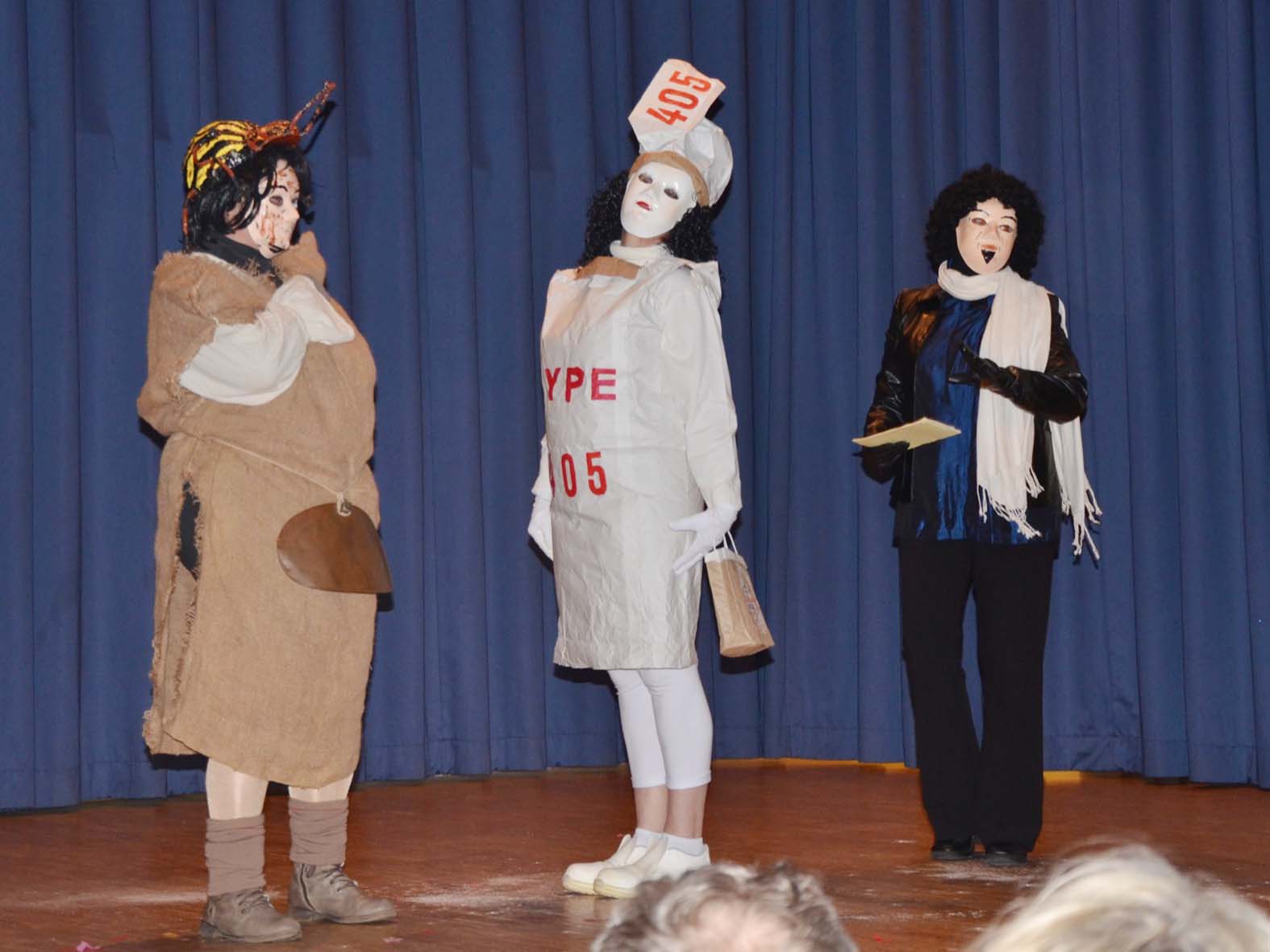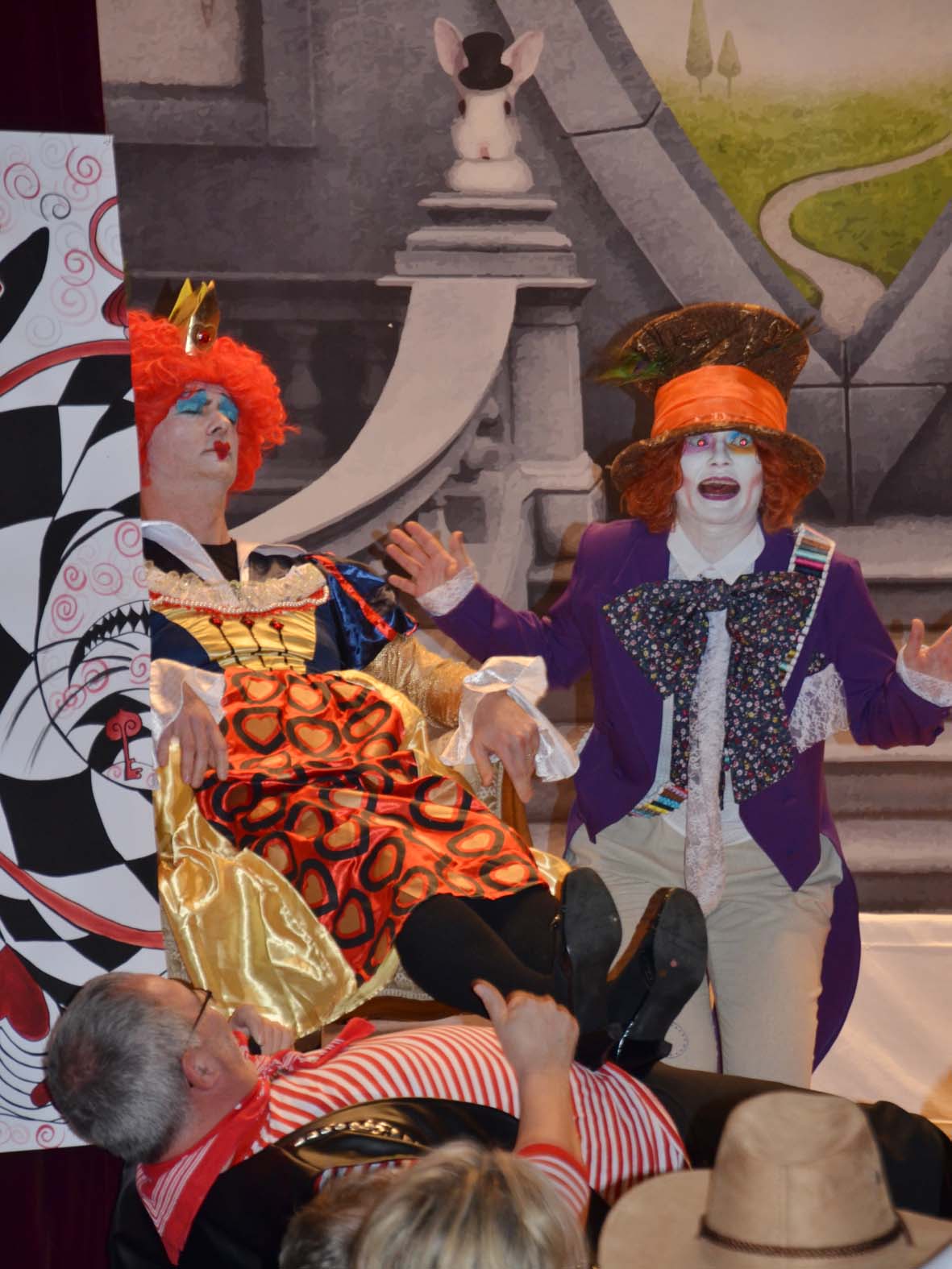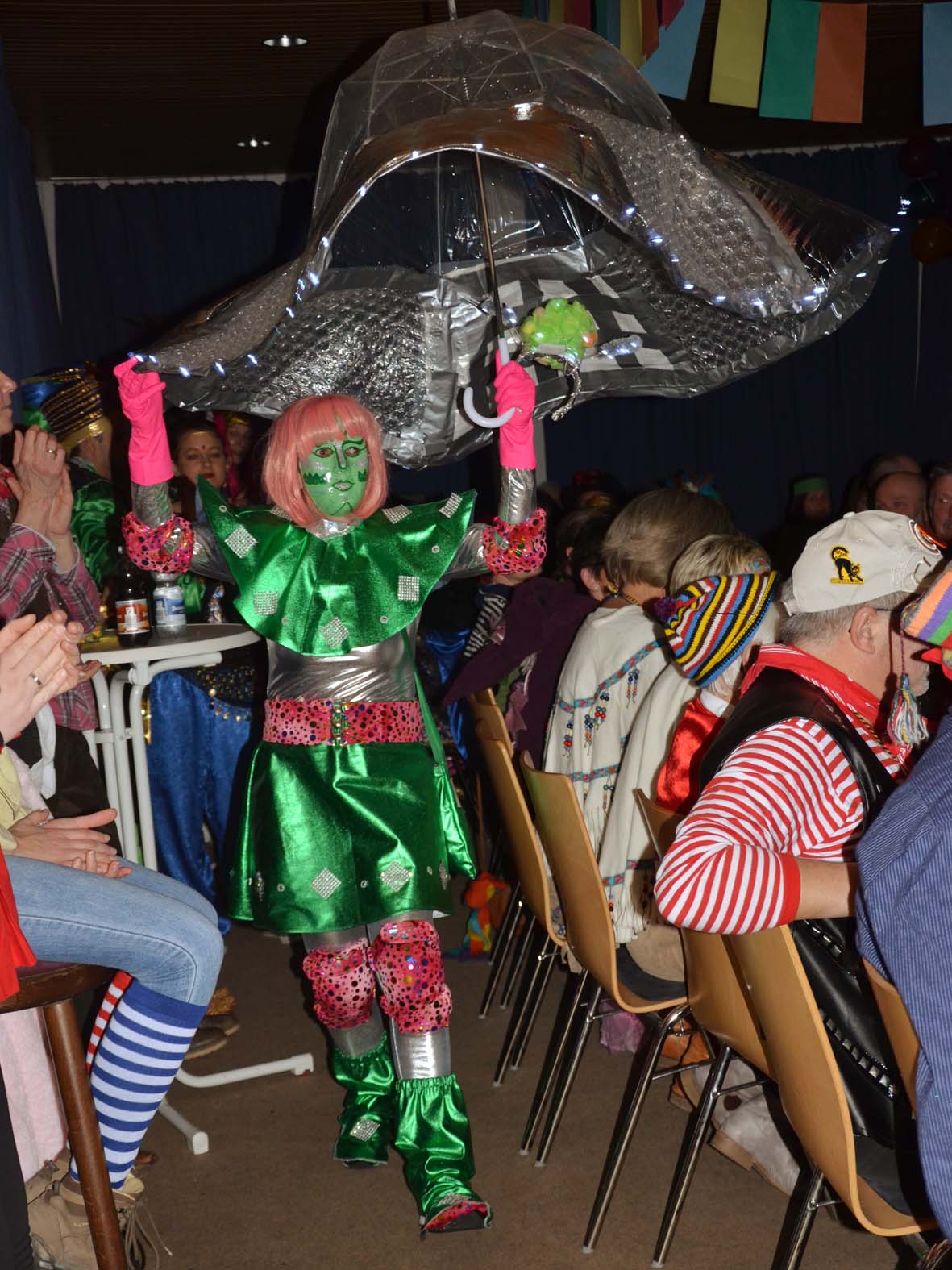 Aus den unendlichen Weiten des Weltraums, von einem fremden Planeten kamen zwei Raumfahrerinnen. Sie begaben sich auf eine galaktische Weltreise auf der Suche nach dem besten Fasendhit. In Brasilien entdeckten sie »Tanze Samba mit mir«, in Moskau »werft die Gläser an die Wand«. Sie tanzten mit Shakira in Afrika »Waka, waka«, reisten an den Broadway nach New York und zur Lotusblume nach Japan. Zum Schluss auf die Zeller Fasend. Die große Fasendsschar kennt gewiss den besten Hit: Cordula Grün. Die galaktischen Wesen mit ihren pinkroten Bobfrisuren, grünen Gesichtern und ihren schillernden Outfits, in eben diesen Farben, tänzelten über die Bühne und das närrische Publikum hob mit ihnen ab in den Fasendshimmel.