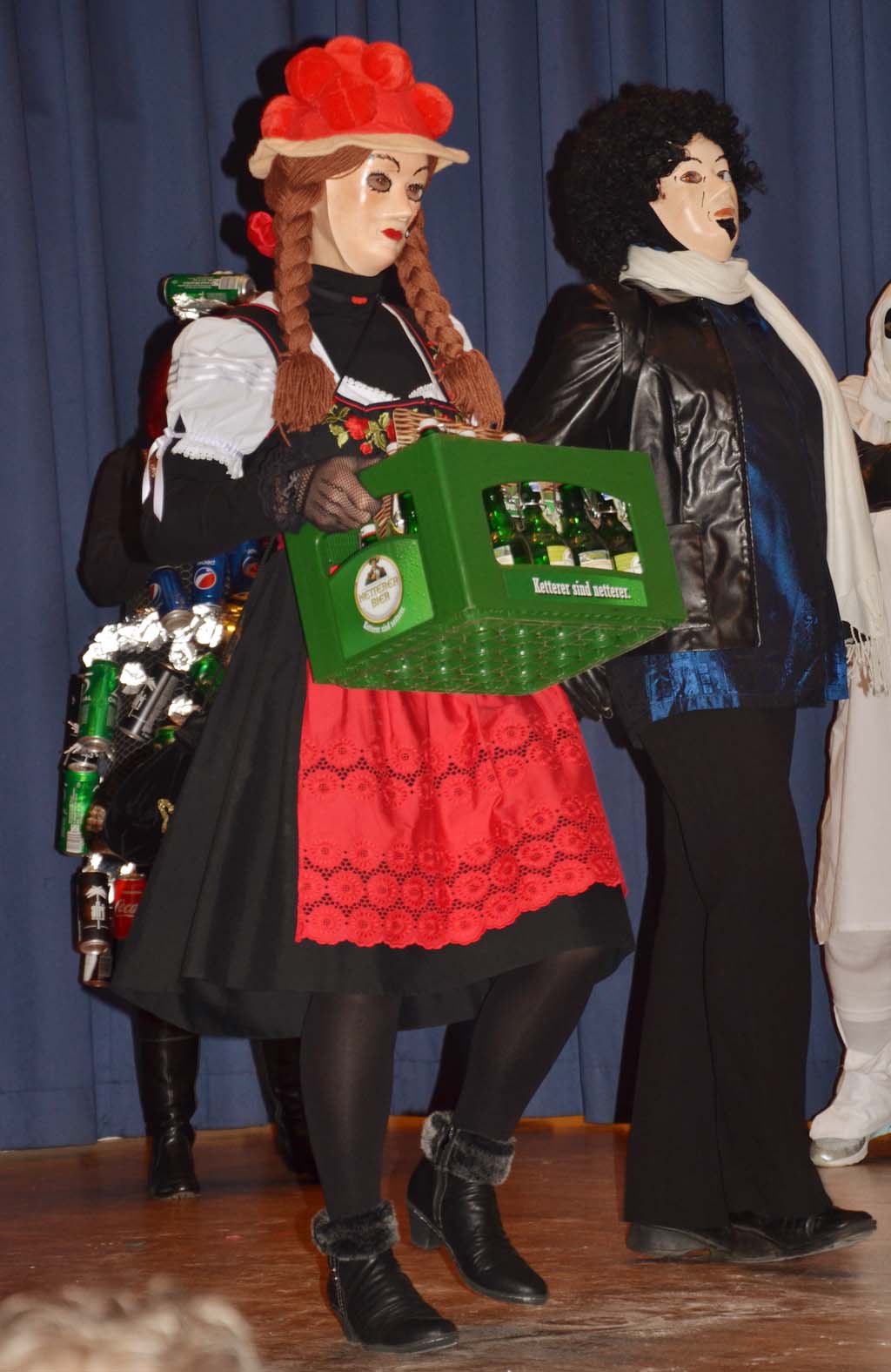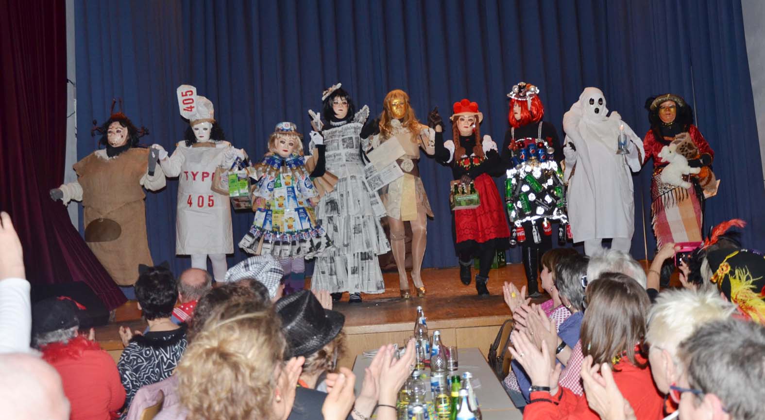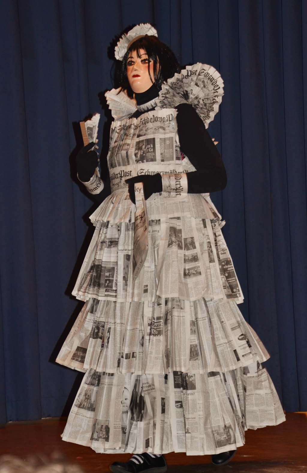 Die Damen aus Klein Paris bauten nicht neu, sondern recycelten Verpackungen, Zeitungen, Stoffe und Textilien zu Haut Couture-Mode. Jute-Kartoffelsäcke und Mehlsäcke wurden zu legeren Hängerle. Das Petticoat Milchtüte mit Hut und Tasche eigne sich ebenfalls für jeden Tag, so die Modemacherinnen. Nur an Abfuhrtagen der gelben Säcke sollte sich die Trägerinnen von der Müllabfuhr fern halten. Das Ballkleid Schwarzwälder Post wird drei Mal in der Woche aktualisiert und ist nicht nur aus diesem Grund ein echter Hingucker. Das Minikleid Tapete macht immer eine tolle Figur. Ebenso die Schwarzwaldmarie mit Ketterer-Kasten-Handtasche. Mit der Petticoat Getränkedose habe die Trägerin immer ein bisschen (Pfand)Geld dabei. Ein Geistgewand aus alten Leintüchern und ein orientalischer Wickelrock aus ausgemusterten Teppichen vervollständigten die Zeller Fasendmodenschau aus Klein Paris.