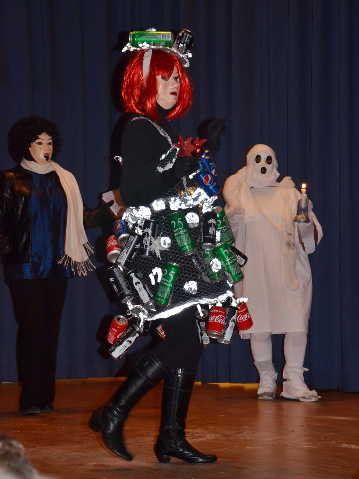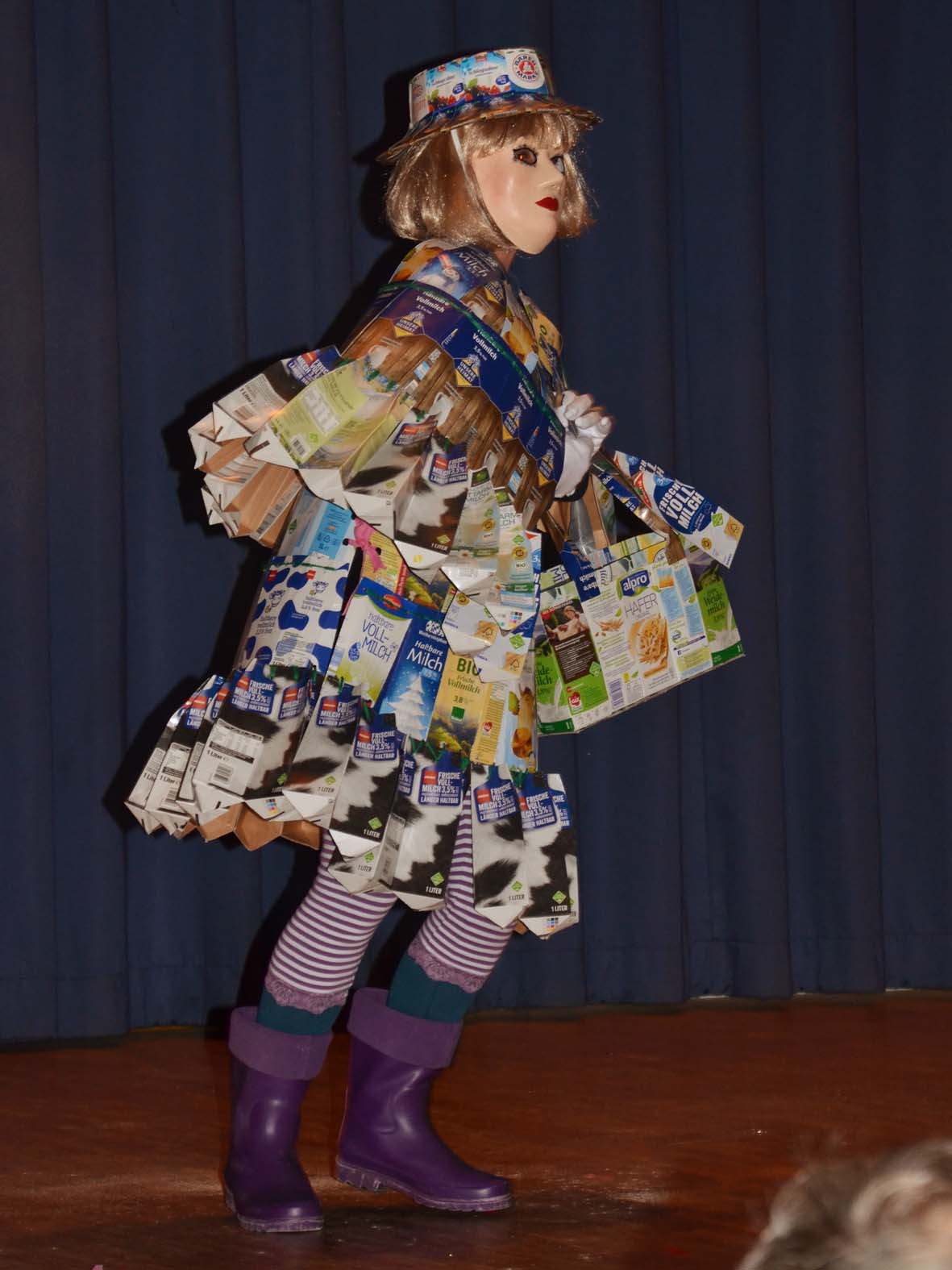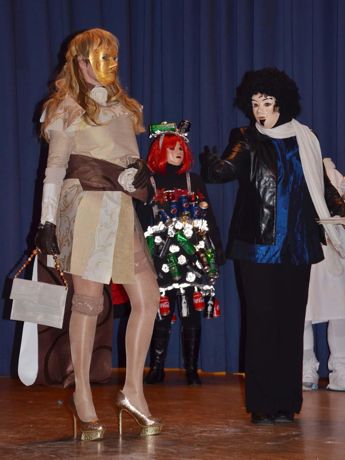Die Damen aus Klein Paris bauten nicht neu, sondern recycelten Verpackungen, Zeitungen, Stoffe und Textilien zu Haut Couture-Mode. Jute-Kartoffelsäcke und Mehlsäcke wurden zu legeren Hängerle. Das Petticoat Milchtüte mit Hut und Tasche eigne sich ebenfalls für jeden Tag, so die Modemacherinnen. Nur an Abfuhrtagen der gelben Säcke sollte sich die Trägerinnen von der Müllabfuhr fern halten. Das Ballkleid Schwarzwälder Post wird drei Mal in der Woche aktualisiert und ist nicht nur aus diesem Grund ein echter Hingucker. Das Minikleid Tapete macht immer eine tolle Figur. Ebenso die Schwarzwaldmarie mit Ketterer-Kasten-Handtasche. Mit der Petticoat Getränkedose habe die Trägerin immer ein bisschen (Pfand)Geld dabei. Ein Geistgewand aus alten Leintüchern und ein orientalischer Wickelrock aus ausgemusterten Teppichen vervollständigten die Zeller Fasendmodenschau aus Klein Paris.