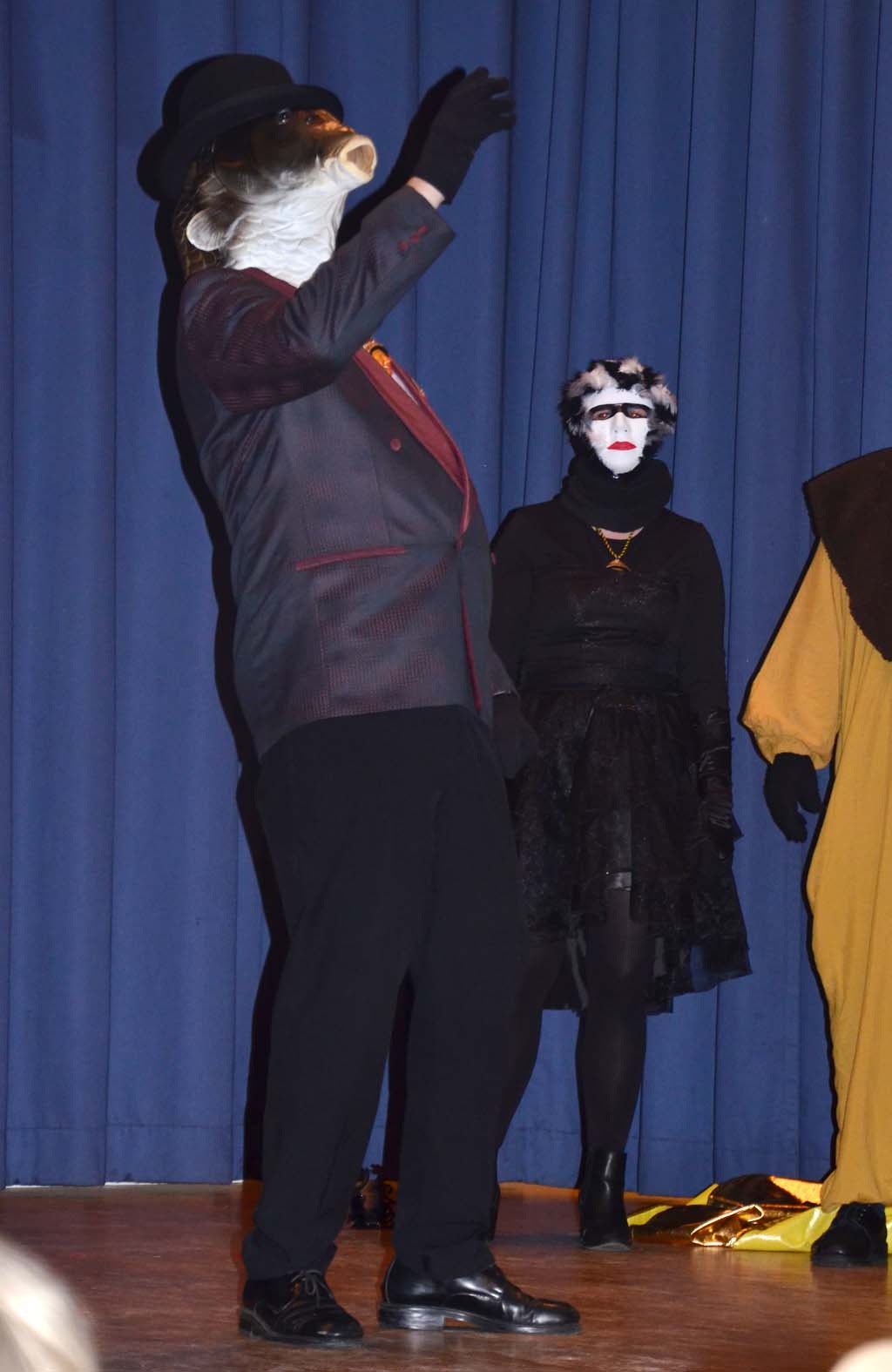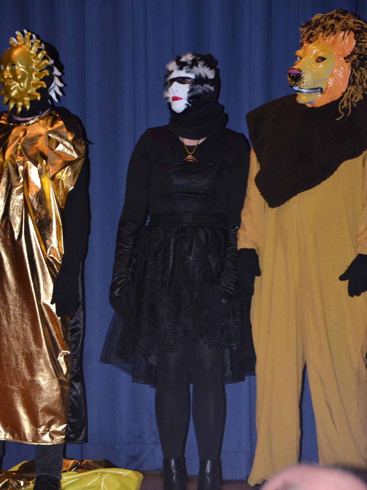 Ein andere Figur war wahrlich mit einer herausfordernden Aufgabe betraut. Das Narro-Engelchen hatte vom Fasendsgott die Aufgabe erhalten, das weitere Wirtschaftssterben bei der Zeller Fasend aufzuhalten.»Wie soll mir das allein gelingen!?« Hoffnungsvoll rief das Engelchen in seinem Spielkarten-, Bändele, Welschkorn- und Schneckehüsli-Narro mit weißen Federflügeln die einstigen Traditionswirtschaften aus dem Fasendshimmel zu sich. In schönen Kostümen mit passenden Larven betraten Löwe, Badischer Hof, Hecht, Schwan und Bär die Zeller Fasendsbühne. Dazu gesellte sich die Sonne aus den Ferien. Doch anders als gehofft, erhielt das Narro-Engele keine rettenden Tipps. Lediglich Bedauern oder Bewunderung (wozu die Gasthäuser sich gewandelt hatten) und die Erinnerungen an goldene Fasendsstunden in ihren Räumen waren zu hören. Das war keine Hilfe. Doch dem Engel kam ein Geistesblitz: »Wenn wir alle zusammen stehen, ihr vielen Narren im Saal und wir Narren auf der Bühne, wird die Zeller Fasend nie untergehen!« Bei der Preis-Polonaise zeigten sich die Gemeinschaftsführer hinter diesen Masken. Für ihre gelungene Inszenierung und hoffnungsvolle Botschaft setzte ihnen das Publikum die Krone der Gruppenmasken auf.