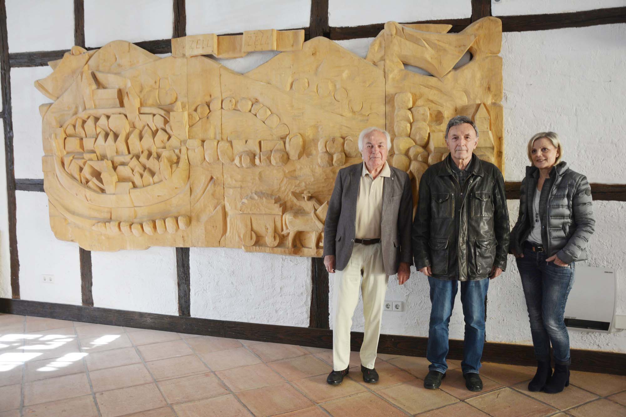 Das über vier Meter Breite, mehrteilige Schnitzwerk wurde von Walter Haaf im Jahr 1982 angefertigt. Es wurde vom damaligen Sparkassen-Direktor Josef Heisch in Auftrag gegeben und zierte lange die Geschäftsstelle der Sparkasse am Stadteingang. Nach deren Schließung ist das Kunstwerk in den Besitz der Stadt Zell übergangen und hing bis zuletzt im Bildungszentrum Ritter von Buß. Dort musste es nun aus Brandschutzgründen entfernt werden.