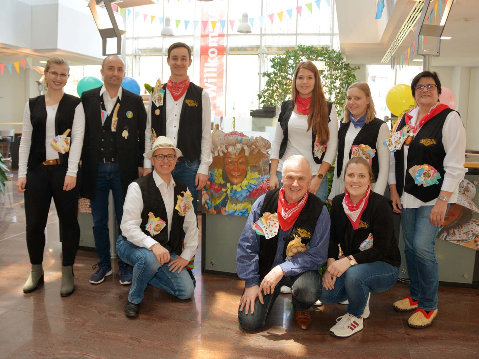 Die hohe Zeit der Narretei geht auch an der Sparkasse nicht vorbei. »Zunftmeister« Jürgen Schmieder (vorne links) und sein Team zeigen sich solidarisch mit der Narrenzunft und schmücken sich mit Bändele, Welschkorn, Karten und Schneckenhüsli. Dass die Fasendutensilien auch einem Nordracher gut stehen, beweist der stellv. Regionalleiter Karl Gallus (vorne rechts), der sich mit der Zeller Narrebluse sichtlich wohlfühlt. Darum grüßen die Sparkässler ihre Fasendkunden mit »Hoorig isch die Katz« und machmal auch mit »Narri! Narro!«