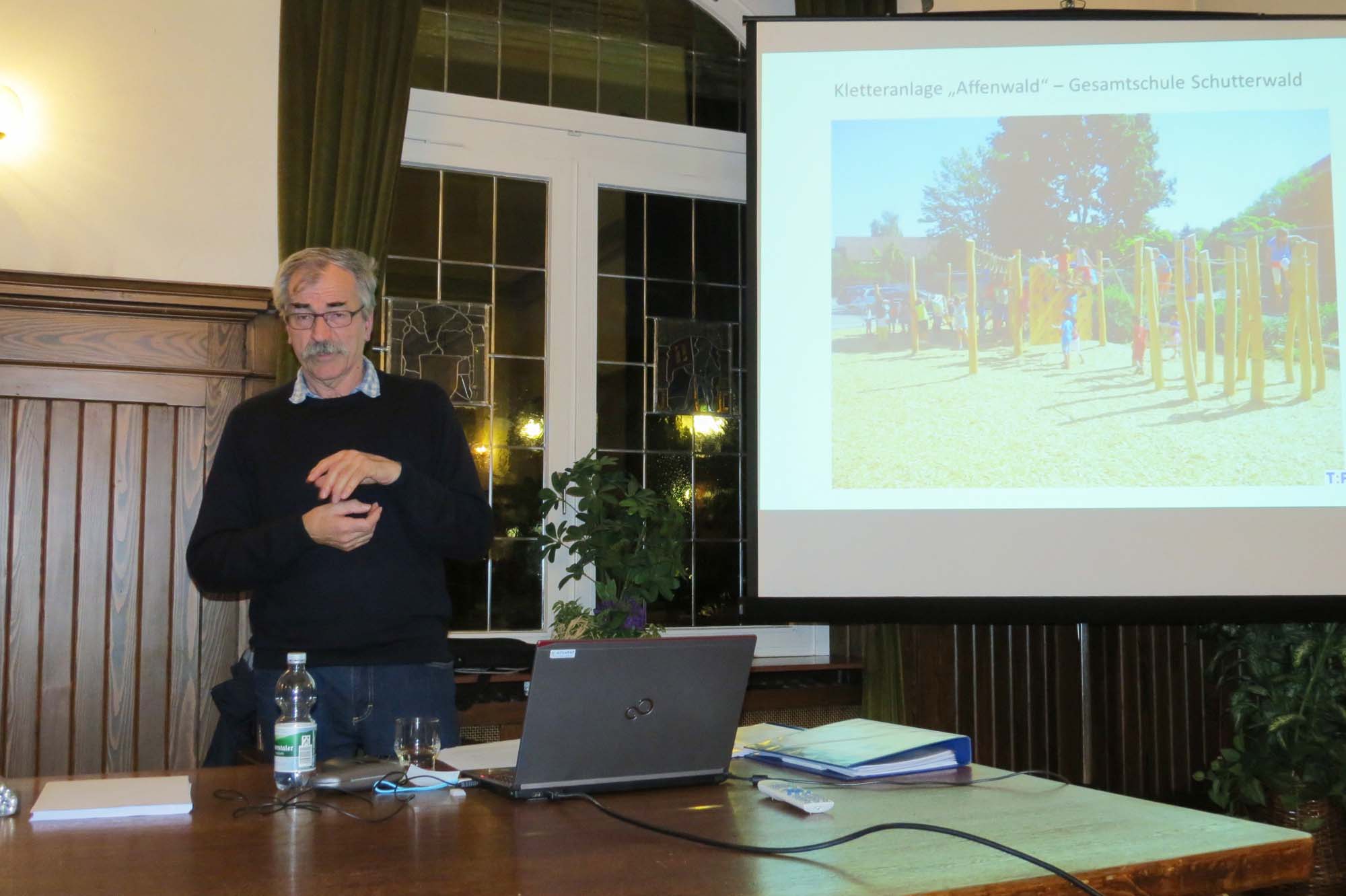 Der Redner des Abends, Wilfried Trapp vom Planungsbüro für Spielraumgestaltung aus Kappelrodeck, hat alle Spielplätze gemeinsam mit Vertretern des Betriebshof besichtigt und bewertet. Bei den Plätzen an Kindergärten und Schulen hat er auch mit den Erzieherinnen und Lehrern gesprochen.