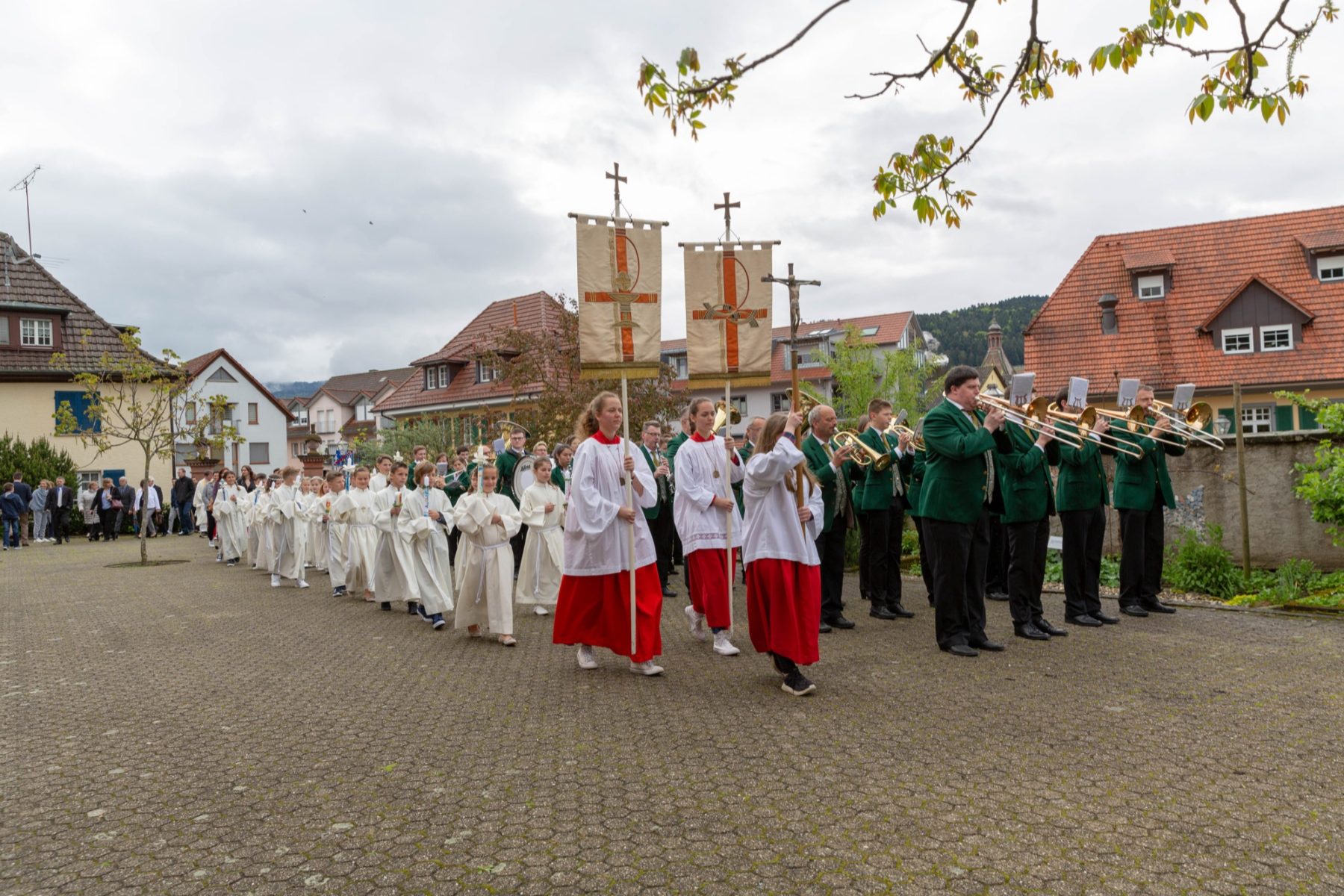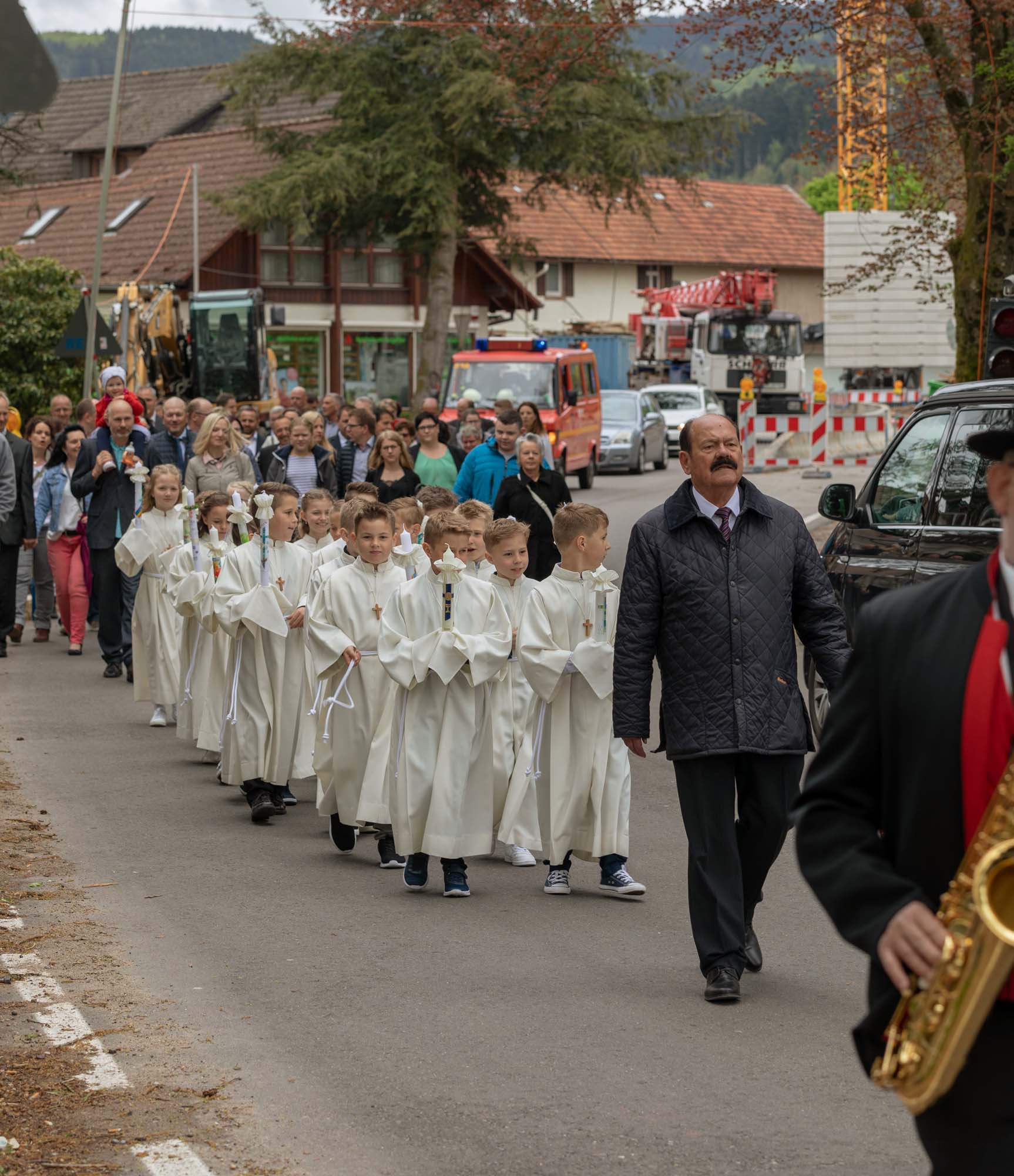 Von Stadtkapelle und Ministranten begleitet, erreichen die Zeller Kommunionkinder den Kirchhof.