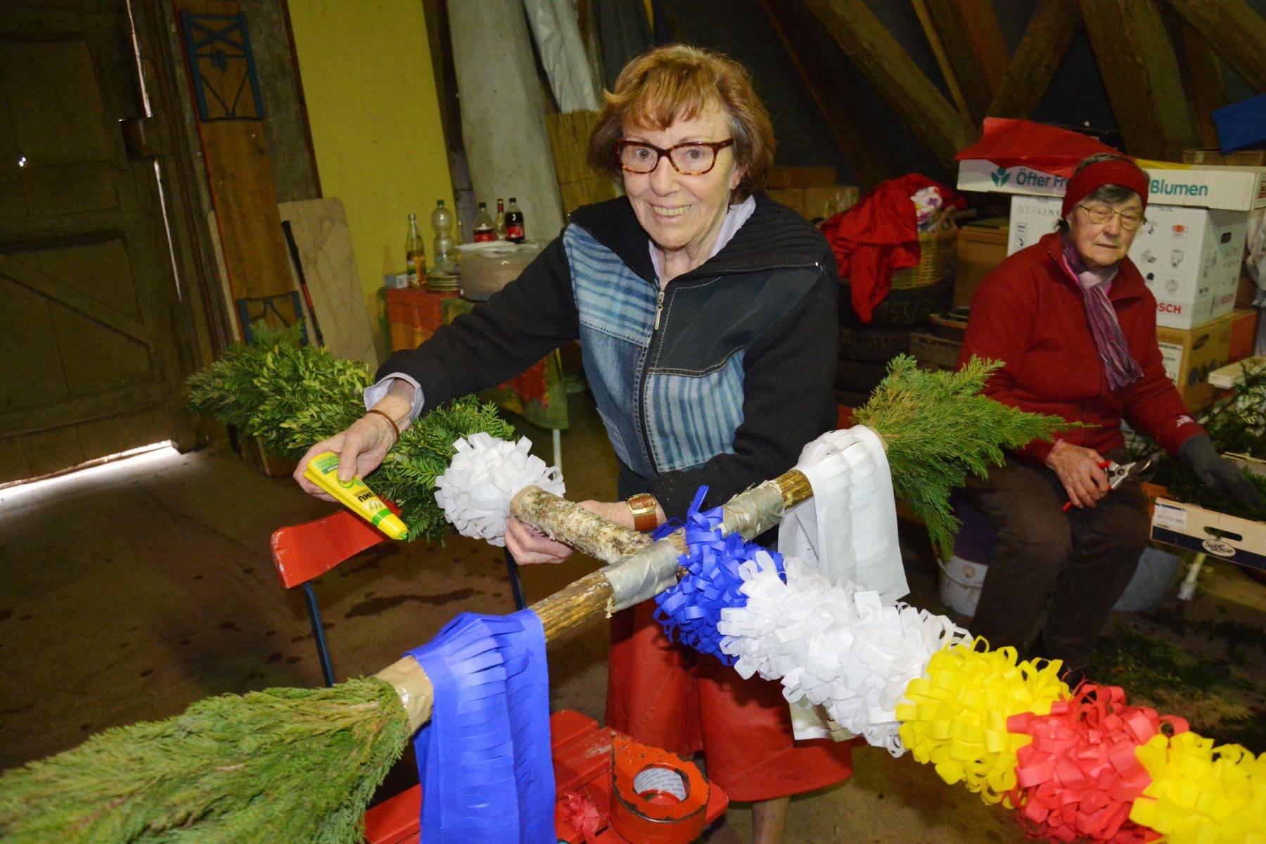 Wie man die Palmen in bester badischer Tradition verziert, hat Hilde Göhring den Familien beigebracht. So taucht auch immer wieder die badische Farbkombination gelb-rot-gelb an den geschmückten Stangen auf. Da es in der Natur immer weniger Buchsbäume gibt, muss beim schmücken auf Thuja-Zweige und anderes Grün ausgewichen werden.