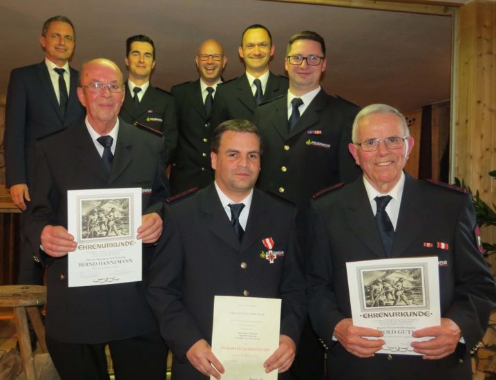 Kreisbrandmeister Bernhard Frei übernahm die schöne Aufgabe der Ehrungen. Zunächst dankte er Florian Lehmann für seine 20-jährige Kommandantentätigkeit: »Du hast die Feuerwehr vorangetrieben und kannst stolz sein auf deine Arbeit.« Es gebe einen hohen Ausbildungsstand bei guter Technik, führte er weiter aus. Bei den Ehrungen freute er sich besonders über die Ehrung von Berthold Gutmann, der seit 60 Jahren der Feuerwehr treu ist und die Ehrenurkunde erhielt. Bernd Hannemann ist 40 Jahre Feuerwehrmann. Robert Bergmann und Florian Nessler wurden für 25 Jahre geehrt und erhielten das Abzeichen in Silber, Pascal Pfend und Kathrina Jilg für 15 Jahre das Abzeichen in Bronze.