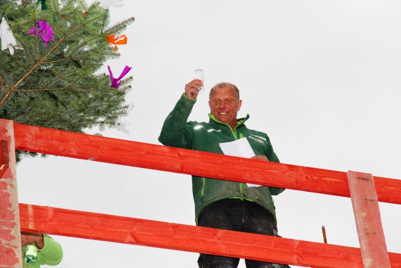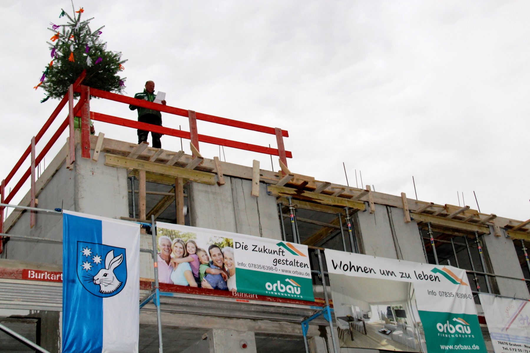 Am späten Mittwochnachmittag wurde der Richtbaum auf das Dach des Rohbaus gehoben, begleitet von schwungvollen Klängen der Kapelle des Musikvereins Harmonie. Auf dem Flachdach stehend verkündete Polier Michael Großmann in gereimter Form den Richtspruch. Gleich mehrfach erhob er das Glas auf das »mit großer Müh und vielem Fleiß, mit Maschinenkraft und Schweiß, aber auch mit Sachverstand« errichtete Gebäude, bevor es nach alter Tradition auf dem Betonboden zerschellte.