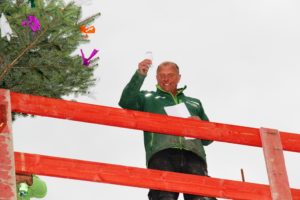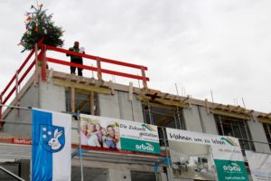 Einsetzender Regen zwang dann die bestens gelaunten Gäste der Feierstunde in das Innere des künftigen Senioren-Pflegeheimes. Dort richtete Orbau-Geschäftsführer Burkhard Isenmann an alle Projektbeteiligten seinen Dank, die in ihrem jeweiligen Verantwortungsbereich ihren Anteil an dem Neubau haben. Lobend erwähnte er die von Polier Michael Großmann angeleiteten Bauleute vor Ort, die noch am Nachmittag desselben Tages die letzte Geschossdecke betoniert und damit den Rohbau auf den Tag genau fertiggestellt hatten.