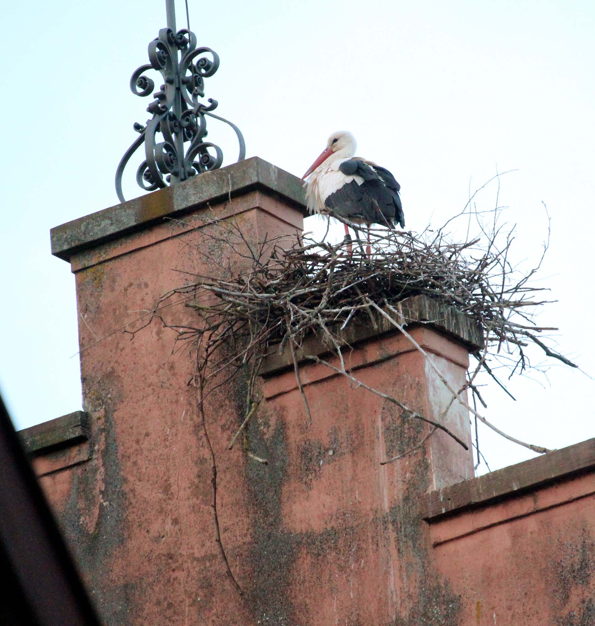 Ein Storch gibt niemals auf! Schon zweimal hat der Sturm dem Storch auf dem Rathausgiebel das Nest sprichwörtlich vom Winde verweht, zuletzt im April. Doch nach kurzer Schockstarre machte sich der Storch unverdrossen wieder an die Arbeit und baute sich eben zum dritten Mal in diesem Frühjahr sein Nest auf dem Rathausgiebel – mit Panoramablick auf Hauptstraße und Kanzleiplatz. Wohnungsnot? Kennt ein Storch nicht, baut sich schnell Nest Nr. 3 und hofft, dass es diesmal Wind und Wetter trotzt.