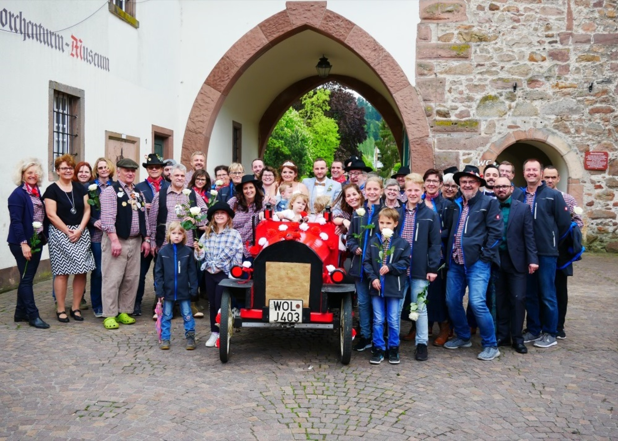 Am 11. Mai bei besserem Wetter gratulierten die Homberle Jennifer Wangler und Fabian Faißt, beide lange Jahre aktive Homberle. Das Brautpaar wurde im wieder reaktivierten Städtleoldtimer zu ihrem Festlokal chauffiert.
