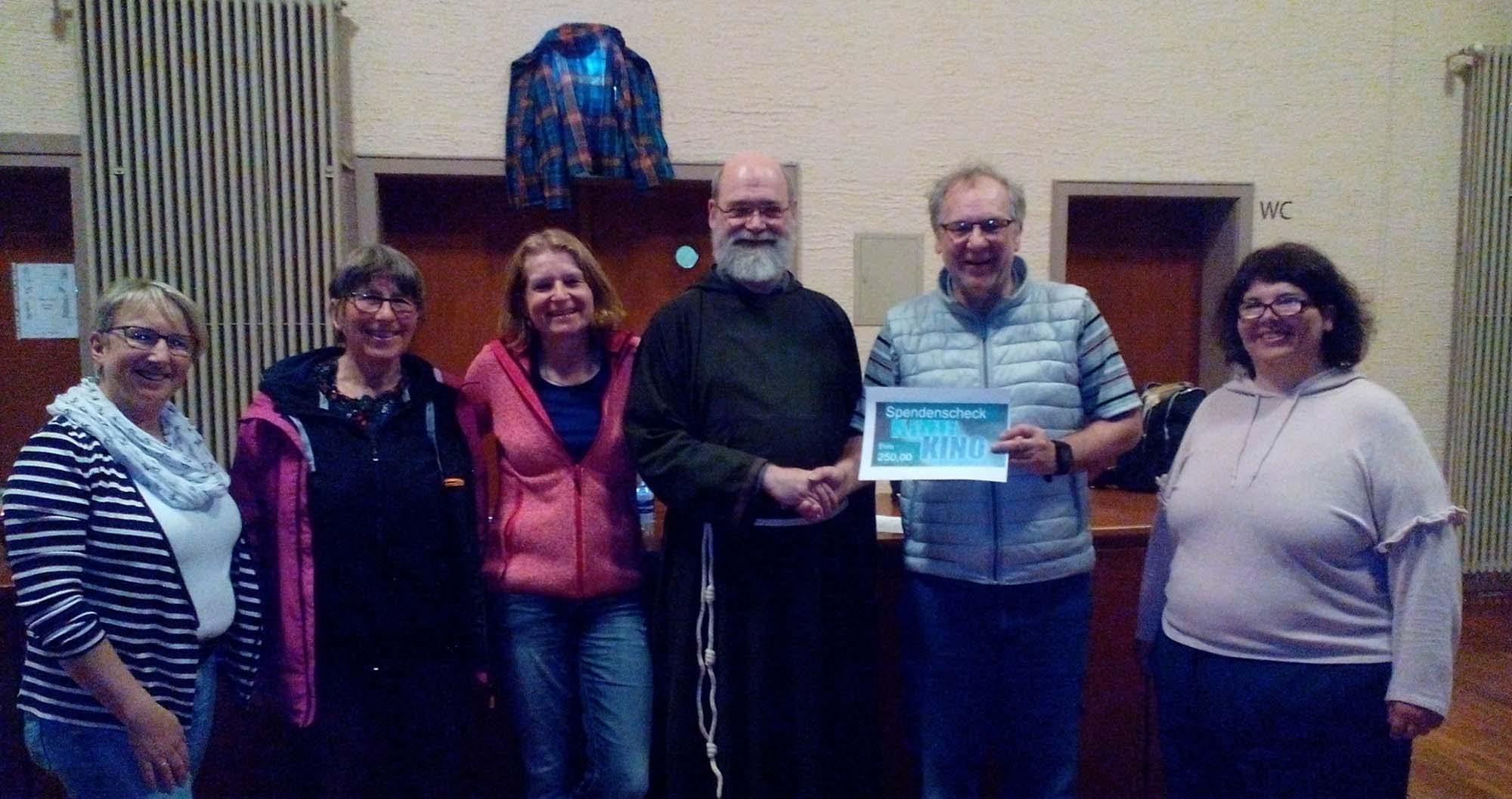 Albert Heizmann (2. von rechts) übergab gemeinsam mit weiteren Helferinnen 250 Euro an Bruder Markus. Die Gruppe dankte dem Kapuzinerkloster für die kostenlose Überlassung der Klosterhalle für die Kino-Kino-Aufführungen. Foto: Hanspeter Schwendemann