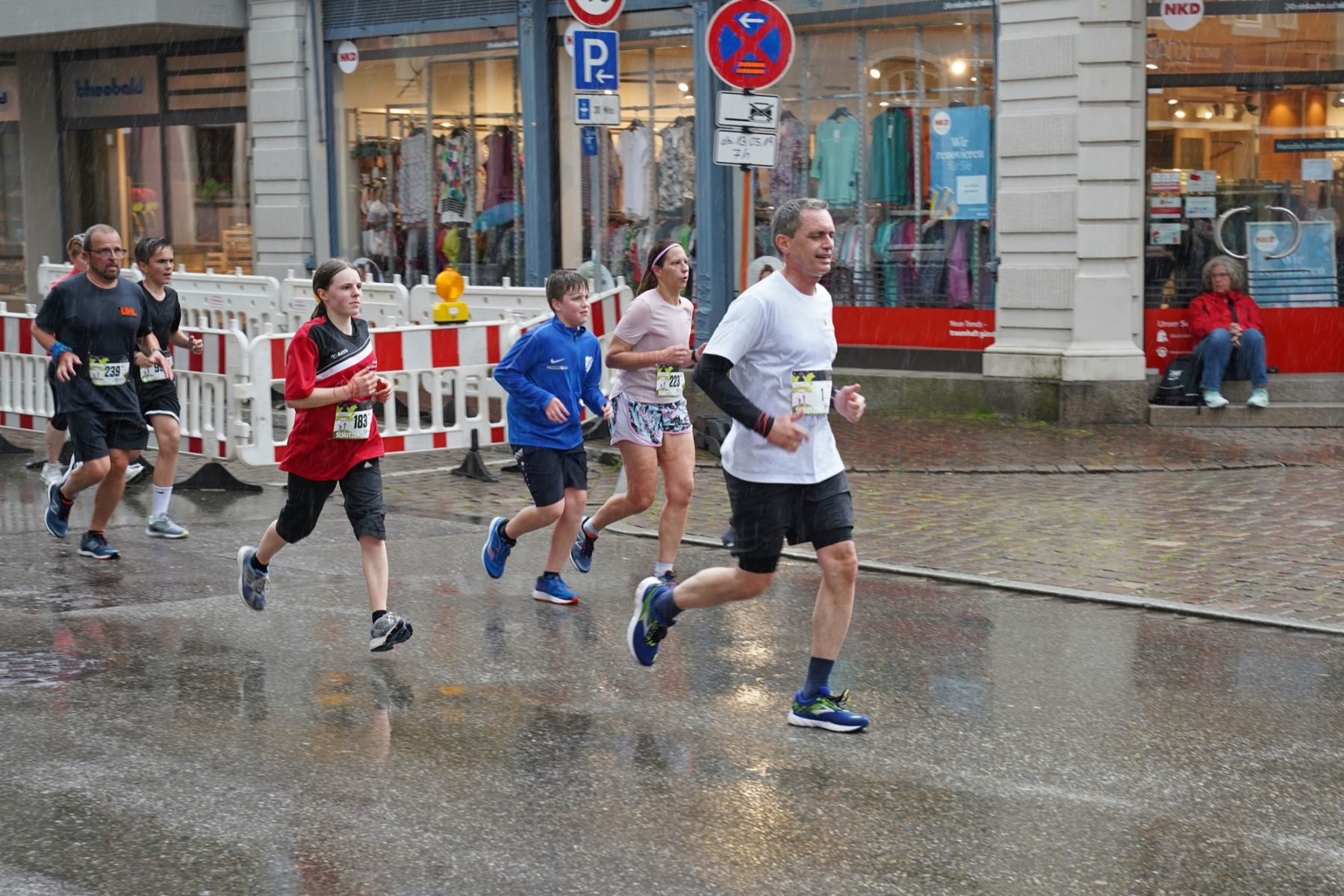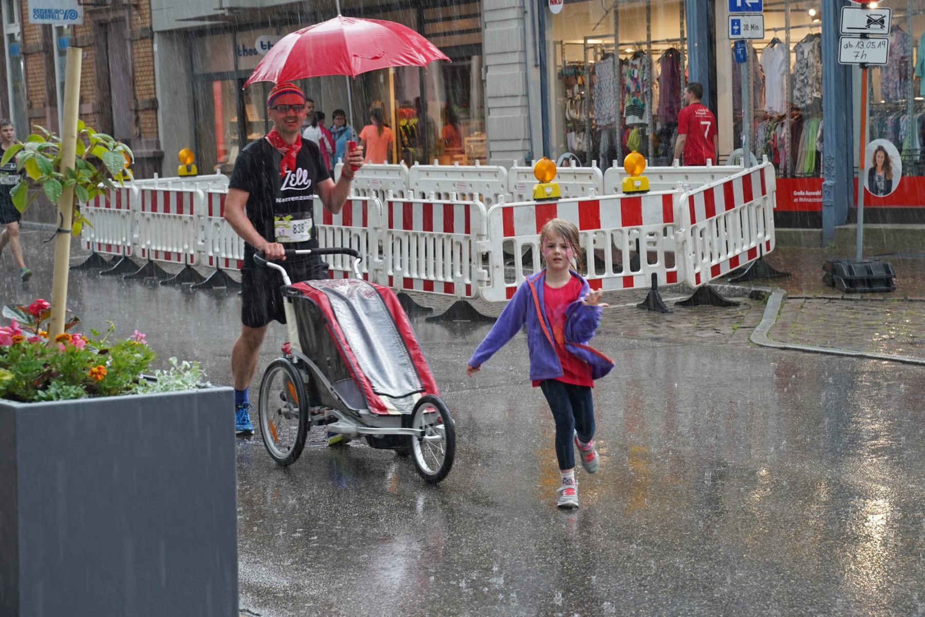 Ungemach drohte dem Schutzengel-Lauf, als gegen 15.45 Uhr dunkle Gewitterwolken über das Tal zogen. Sturmböen warfen Zelte und Schilder auf dem Kanzleiplatz um, ehe dann ein kräftiger Platzregen die Teilnehmer auf der Strecke und die Helferinnen und Helfer durchnässte.