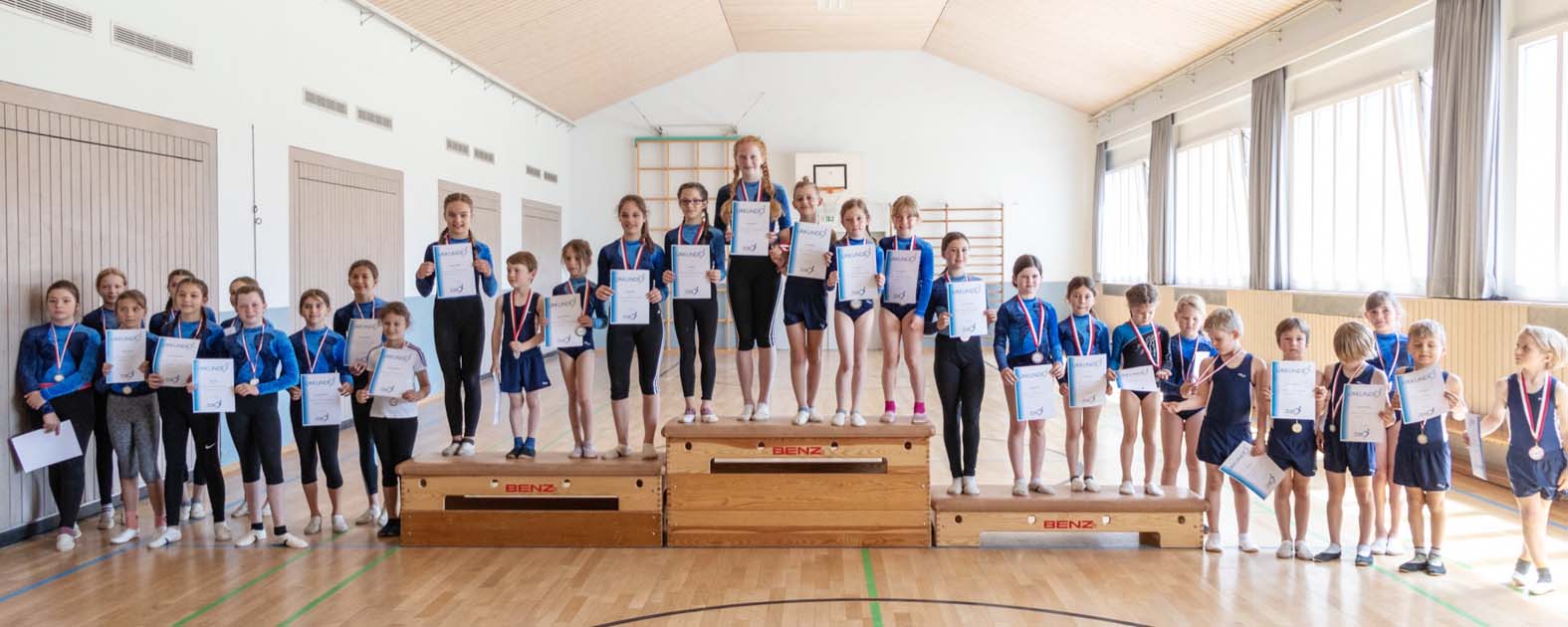 Nachdem alle Turner/-innen an jedem Gerät ihr Können bewiesen haben, wurden alle Wertungen der Kampfrichter im Wettkampfbüro verrechnet. Kurze Zeit später folgte dann auch die Siegerehrung. Das Lied „Stand up for the champions“ ertönte und die Champions des Tages liefen in die Halle ein. Gespannt warteten sie dann auf die Ergebnisse. Jede/r Teilnehmer/in der Vereinsmeisterschaft hat eine Urkunde und eine Medaille erhalten. Ein gelungener Vormittag ging zu Ende bei dem die Turner/innen im kleinen Rahmen neue Wettkampferfahrung sammeln konnten.