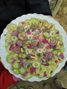 Zwei große Gurken wurden in handliche Scheiben geschnitten und mit unterschiedlichen ganzen Blüten und Blütenblättern dekoriert. Selbstverständlich wurde die Dekoration mitgegessen. Ein weiteres Hauptgericht waren die Brennnesselburger. Aus Haferflocken, Dinkelmehl, Zwiebeln, Karotten, Eiern, Brennnesselblättern und Bärlauch, gewürzt mit Meersalz und Pfeffer wurde eine Masse gerührt, aus der dann mühsam die Burger geformt wurden. Gebraten und auf einem Blatt serviert mit einer Quarkcreme waren dies im Nu weggeputzt.