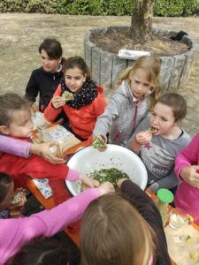 Die erste Aufgabe der Kids bestand darin, die vielen unterschiedlichen Kräuter und Blüten möglichst klein zu schneiden und zu zupfen. Jetzt war das Schmieren von Butterbroten dran. Frisches Brot, Butter und die frischen Kräuter waren ein für die meisten Kinder ein tolles zweites Frühstück. Aber nicht alle waren begeistert. »Nutella schmeckt besser«, meinte einer der Jungs. Ihm war an diesem Morgen aber nicht zu helfen.
