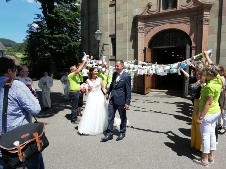 Nach einem stimmungvollen Wortgottesdienst mit Pfarrer Seibt wurden die Frischvermählten bei herrlichem Sonnenschein draußen mit einem Spalier aus allerhand Heilmittelchen von den Arbeitskollegen der Braut aus der »Apotheke am Kurgarten« empfangen, um das Paar auf den Weg in ein gesundes Eheglück zu schicken. Anschließend ging es zum Sektempfang bei dem Braut und Bräutigam nicht nur die vielen Glückwünsche der Familienangehörigen und Freunden entgegennehmen durften, sondern auch gleich die erste gemeinsame Aufgabe auferlegt bekamen. So brachte der Freundeskreis kurzerhand einen Spalter samt Baumstamm mit zum Sektempfang, den das Paar kleinspalten musste. Passend zu den Gegebenheiten entpuppte der Baumstamm noch eine versteckte Flasche Sekt.