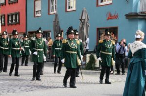 Zum Schluss verabschieden sich alle Formationen vor dem Rathaus. Mit einer Fahnenparade und einer Ehrensalve der Zeller Bürgerwehr für die Stadt, die Bürger und Gäste, beschließen die Musikkapellen und Bürgerwehren den Festtag.