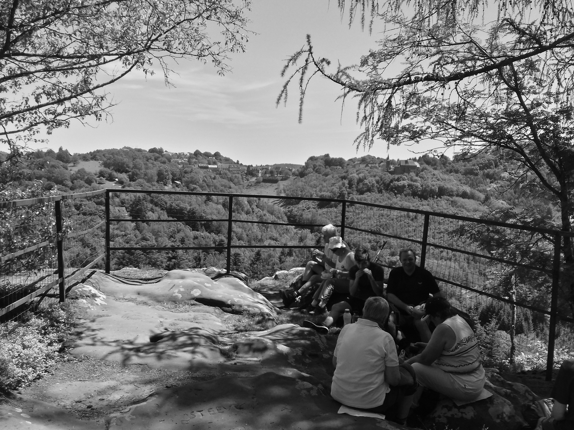 Nun begann die Wanderrunde. Durch schönen Laubwald führte der Weg auf und ab bis man auf den gegen­über dem Schloss liegenden »Weißen Felsen« kamen. Hier machte die Wandergruppe aus Zell Rast, genoss die Aussicht und das mitgebrachte Vesper.