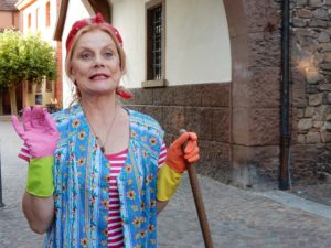 Beim Treffpunkt am Storchenturm erwartete die Gruppe eine Augenweide von Putzfrau. Gut gestylt mit Schurz, Kopftuch, Badeschlappen und bewaffnet mit Strupfer, Putzeimer und Lappen. Allein diese Accessoires brachten alle zum Lachen.