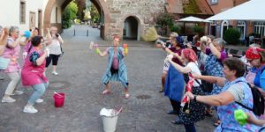 Wilma Strupfer stellte sich der Gruppe vor und berichtete, dass sie eine leidenschaftliche Putzfrau ist und keinen Dreck sehen kann. Sie erzählte der Gruppe einiges über die Stadtgeschichte von Zell – angefangen am Storchenturm mit den Schwedenkanonen. Diese hätten Wilma und die LandFrauen auch geputzt, leider hatte man keine Leiter. Dafür wurden auf dem Kanzleiplatz den dort vorbeigehenden Personen die Flusen und Flecken von der Kleidung entfernt.