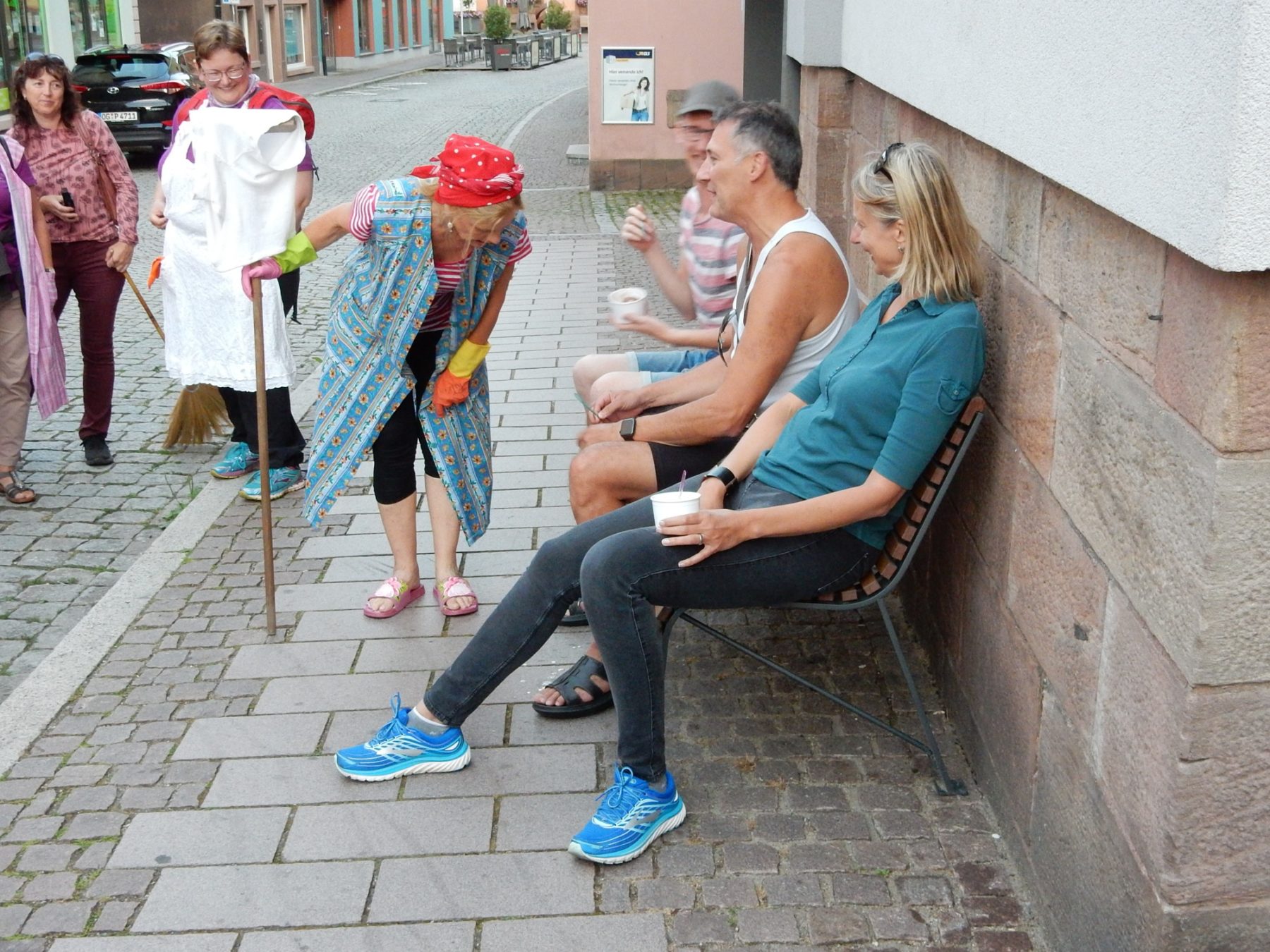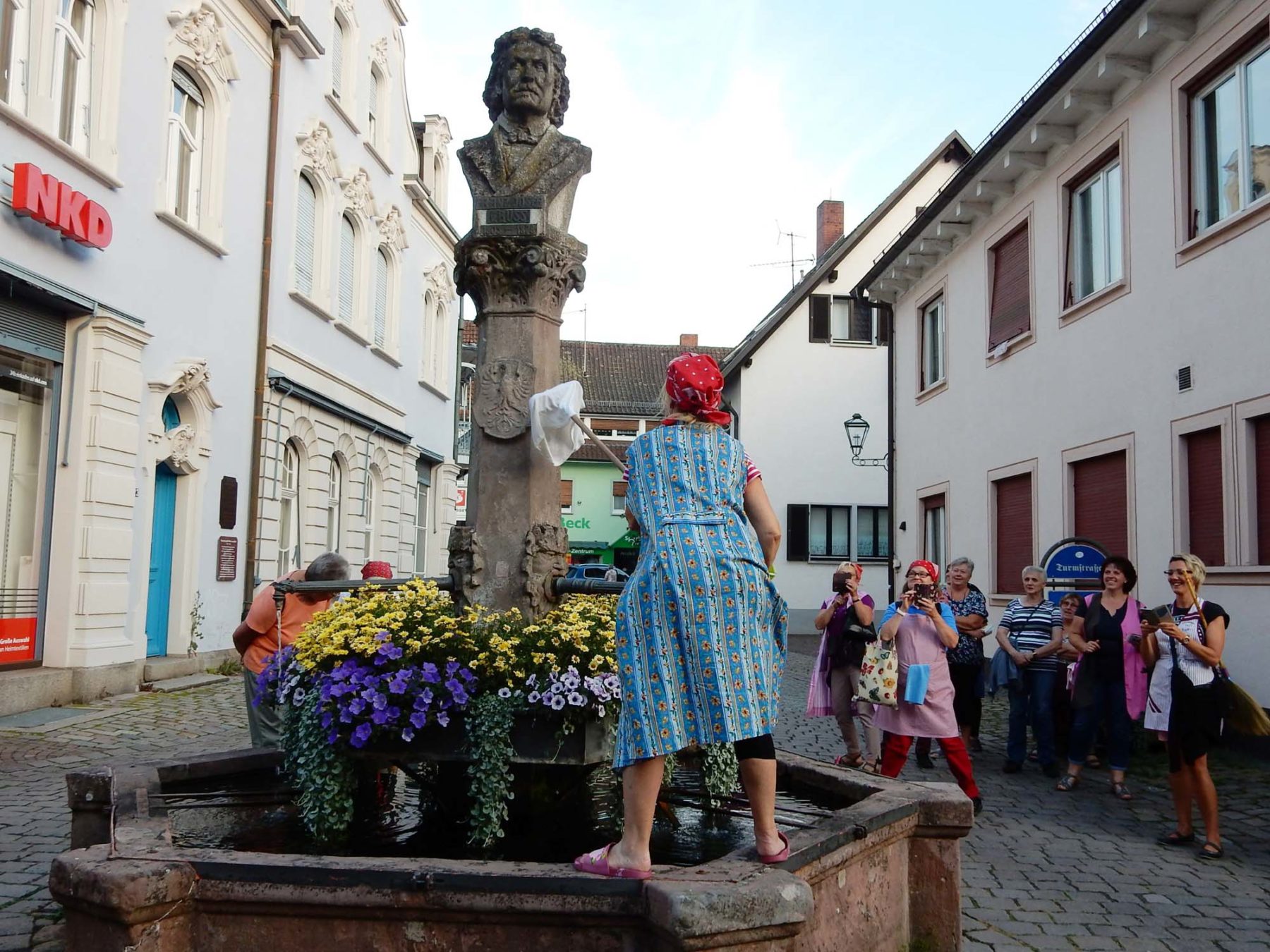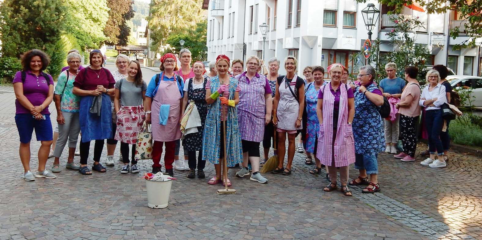 Nach ihrer Aussage konnte sie dabei schon die nettesten Personen kennen lernen. So zogen alle zusammen durch das Zeller Städtle und putzten die Fenster an der Informationstafel beim Rathaus. Am Geburtshaus von Franz Josef Ritter von Buß erzählte sie dessen Lebenslauf und natürlich wurde auch seine Statue am Brunnen abgestaubt. Weiter dann durch die Roßgass – leider konnte man keine Pferdeäpfel aufkehren, es war schon blitzblank – lief man weiter zum Hirschturm. Vor den dort sitzenden Gästen legte Wilma Strupfer eine perfekte »Putzshow« hin. Immer putzend gelangte die Gruppe dann zur Sparkasse, dessen Kassenvorraum natürlich auch gewischt wurde. Unterwegs erzählte Wilma herausragende Ereignisse von Zell, wie über den Rundofen, die Waschküche am Bach und vieles mehr. Geschmückt wurde das ganze mit lustigen Anekdoten, sehr zur Belustigung aller Teilnehmer und den Personen auf der Straße, die immer wieder in ihr Geschehen mit einbezogen wurden. So kam die Gruppe schließlich wieder auf dem Kanzleiplatz an. Man dankte Billy Sum-Herrmann »Wilma Strupfer« für den schönen und lustigen Stadtrundgang. Der Abschluss war dann für alle im »La Piazza«. Ein weiteres Dankeschön gilt Bürgermeister Pfundstein, welcher für die »Stadtputzete« den LandFrauen ein Getränk spendierte.
