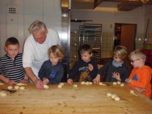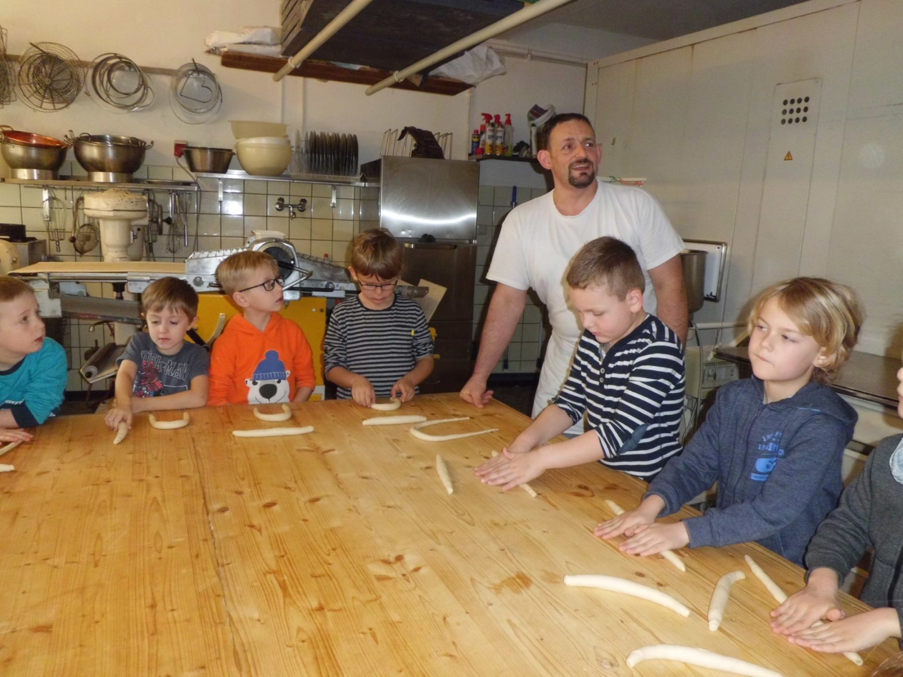Es wurde gemeinsam ein süßer Hefeteig hergestellt. Zuerst widmete sich die Gruppe aber dem salzigen Hefeteig, der schon vorbereitet da stand. Jedes Kind lernte unter fachkundiger Anleitung durch Josef Roth und mit Hilfe des Bäckergesellen Mathias Roth und des Lehrlings Tobias Vollmer selbst eine Brezel, einen Laugenzopf oder einen Laugenknoten zu formen. Aus dem dritten Teigstück durfte jedes Kind seine eigene Kreation formen. Die Laugenteile wurden anschließend mit Lauge geduscht und kamen in den Ofen. Inzwischen haben die Kinder gelernt, wie aus drei süßen Hefekugeln, die mit dem Brötchenportionierer gleichmäßig vorgeformt wurden, zwei Hefehäschen werden können. Jedes Kind hat seine Häschen mit Hagelzucker, Rosinen, Schokolinsen oder Streuseln verziert. Während das Gebäck im Ofen fertig gebacken wurde, haben die drei Bäcker den Kindern noch verschiedene Flechtzöpfe oder Schaustücke für Prüfungen gezeigt.
