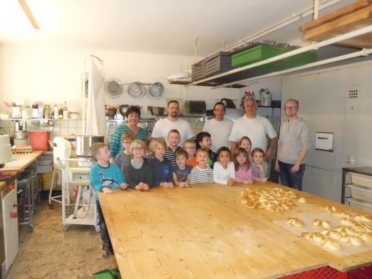 Auch ließ es sich der Chef Joachim Schwendemann nicht nehmen, selbst nach den vielen fleißigen Helfern in seiner Backstube zu schauen. Mit einem Lied haben sich die Kinder für den interessanten und informativen Vormittag bedankt. Nachdem jedes Kind seine Backstücke in eine Tüte gepackt hatte, startete die Gruppe reich beschenkt, zufrieden und glücklich wieder nach Hause, wo alle von einem erlebnisreichen Vormittag mit vielen neuen Erkenntnissen berichten konnten.