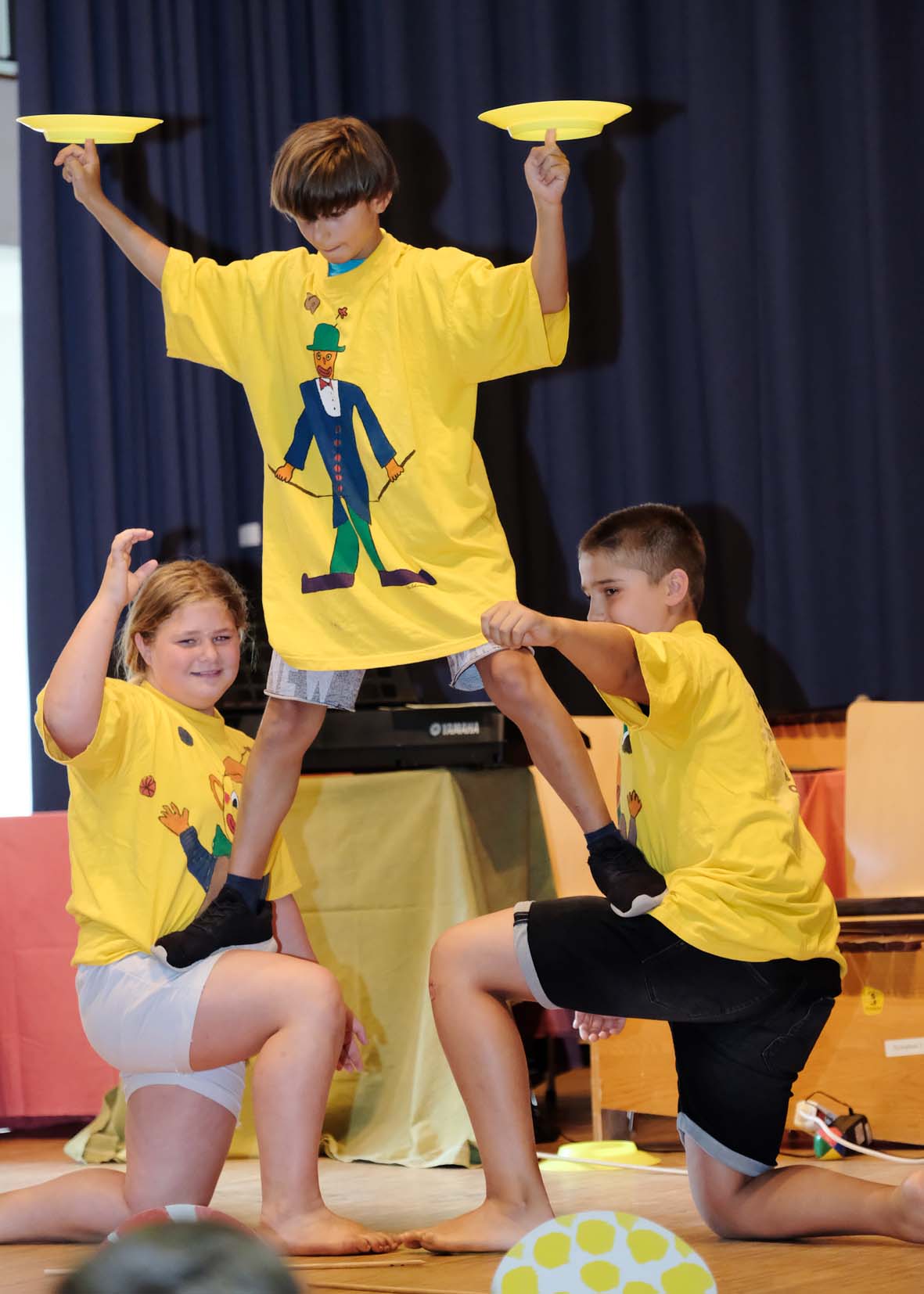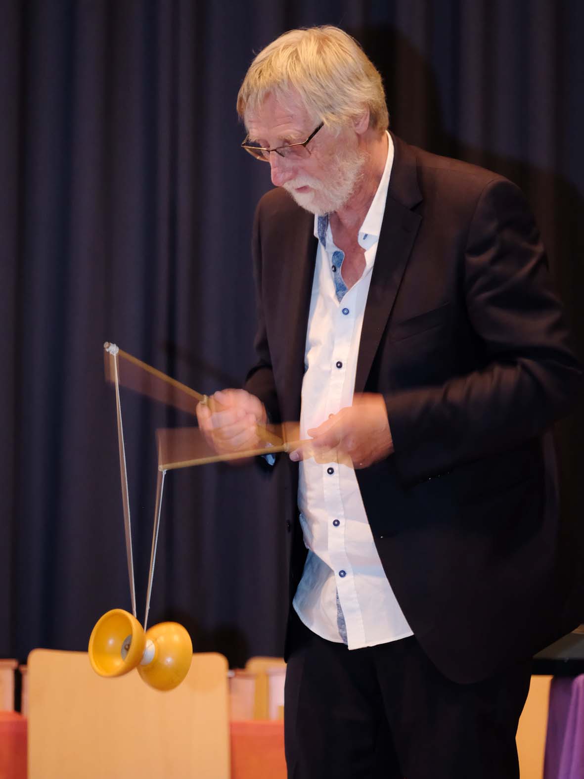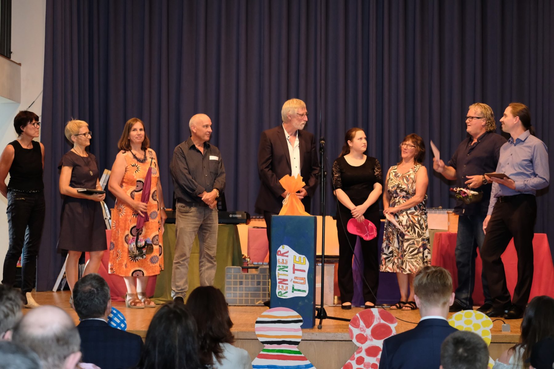 Die knapp zwei Stunden zuvor waren prall gefüllt mit Rückblicken, guten Wünschen in die Zukunft und Geschenken und natürlich hatten auch die Schülerinnen und Schüler des SBBZ jede Menge Unterhaltsames für ihren Schulleiter auf die Bühne gezaubert. Die »Orff Rock Allstars« bewiesen Rhythmusgefühl und der Zirkus Karambolage begeisterte das Publikum mit Akrobatik so mitreißend, dass der zu Verabschiedende selbst auf die Bühne kam und sein Können am Diabolo präsentierte. Es waren Feuerspucker und Fakire zu sehen, es wurden Balance-Akte und Jonglagen gezeigt.