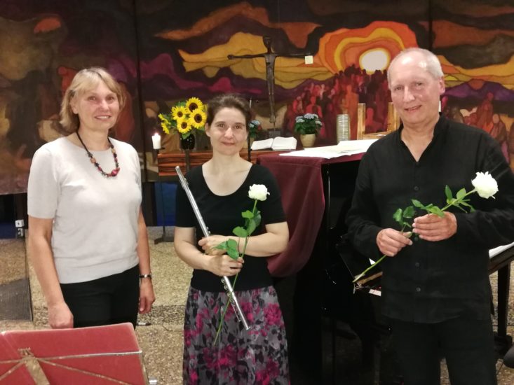 Als wolle der Tonschöpfer seine Interpreten in einer Tour de Force an die Grenzen der Spielbarkeit führen, fordert der dritte Satz den Einsatz weiterer virtuoser dynamischer Kunstgriffe. Assoziationen mit zwitschernden Vögeln kamen auf. Es folgten atemberaubende Läufe, häufige Triller der Flöte gehörten dazu und ahmten die Tiere tonmalerisch nach. Dass der Pianist die harten Kontraste nicht einfach aufeinanderprallen ließ, sondern selbst im wuchtigen Akkordspiel subkutane Melodien herausarbeitete, löste im Kirchensaal Begeisterung aus.
