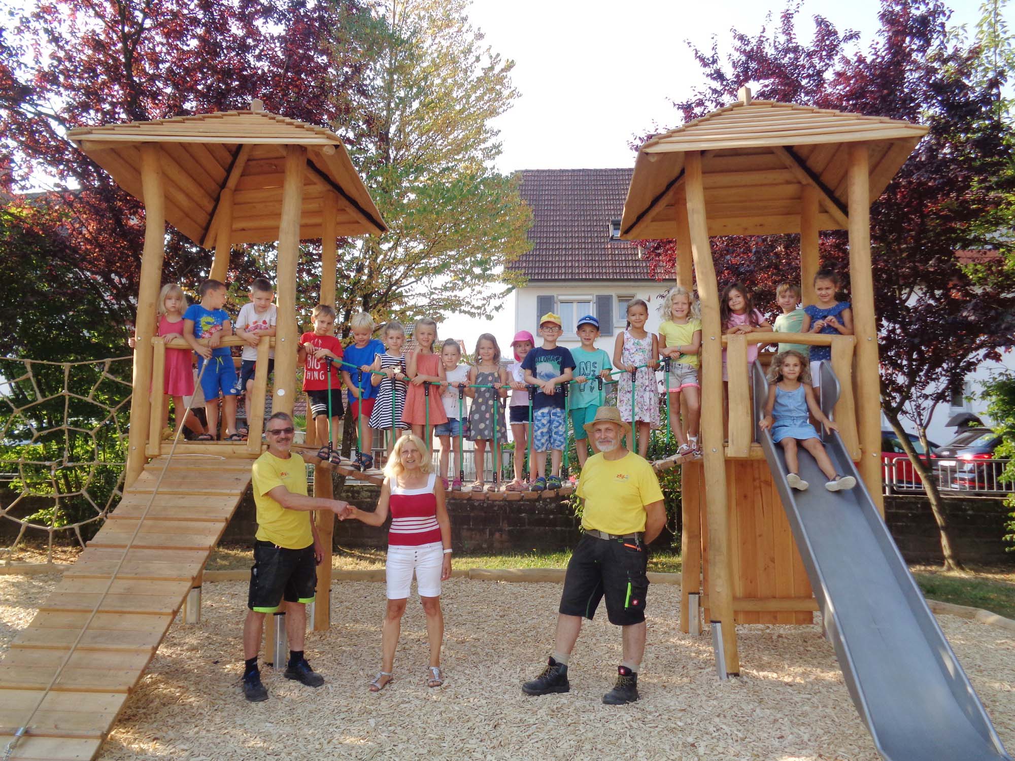 Die Kinder konnten es kaum erwarten, dass es im Rahmen der Schulanfängerverabschiedung eingeweiht werden sollte. Schon lange haben die Kinder darauf hingefiebert, das neue Klettergerüst zu stürmen. Die Stadtarbeiter haben bei hohen Temperaturen das Spielgerät rechtzeitig zum Fest aufgebaut.