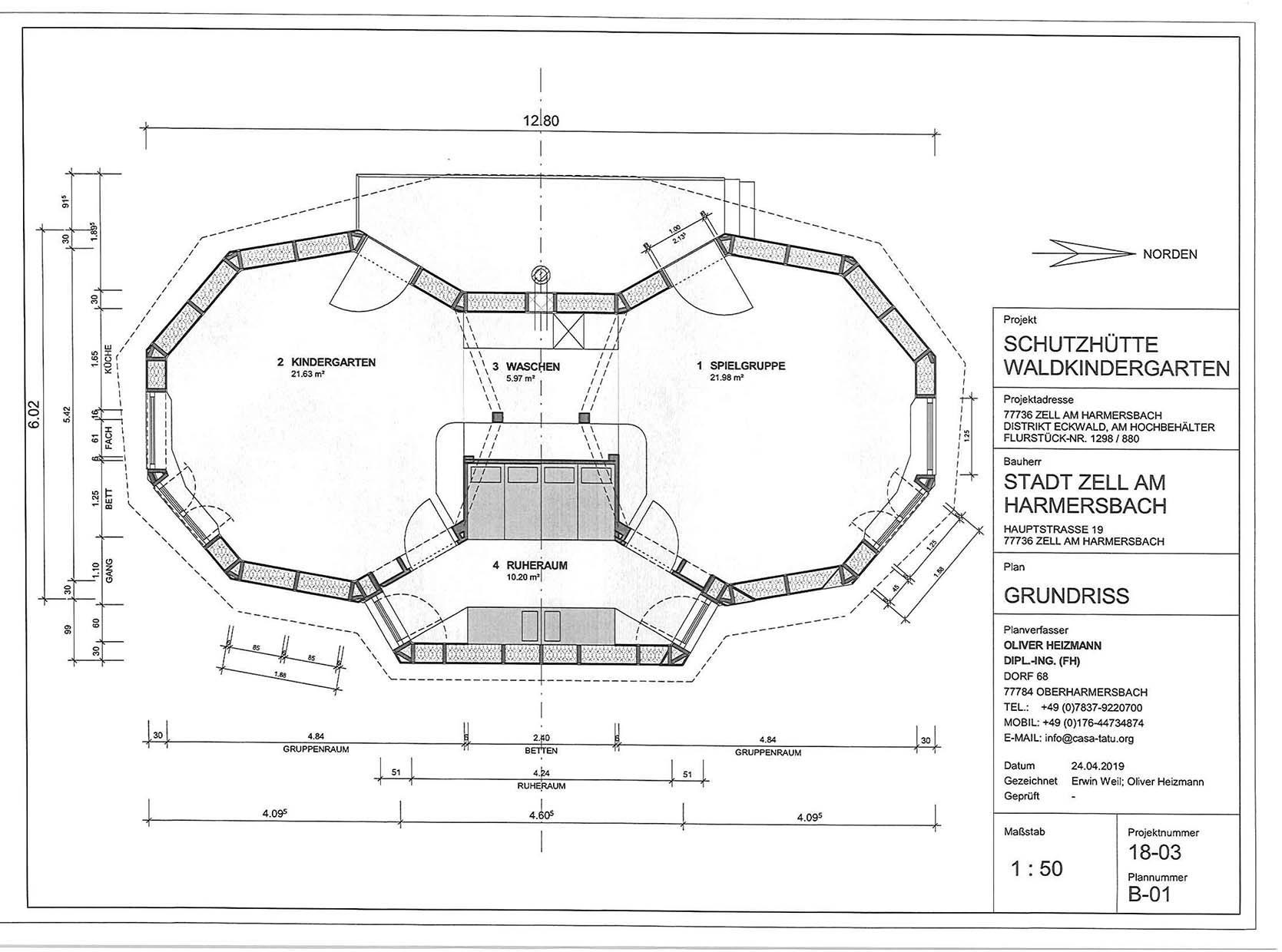 Errichtet wird auf der Lichtung am Eckwald-Hochbehälter ein zweigliedriges Gebäude mit einem selbsttragenden Mandala-Dach und verbindenden Räumlichkeiten. Weil das Kindergarten-Konzept vorsieht, dass die komplette Zeit, soweit es die Sicherheit erlaubt, im Freien verbracht wird, reichen 60 Quadratmeter aus: 21 Quadratmeter sind jeweils den beiden Gruppen, der Waldspielgruppe und dem Kindergarten, vorbehalten. Dazu kommt ein Waschraum und ein Ruheraum, in dem acht Schlafplätze vorhanden sind. Auch eine Komposttoilette wird es geben. »Die Idee hat sich nach und nach aufgebaut«, berichtet Planer Oliver Heizmann aus Oberharmersbach. Zusammen mit Erwin Weil, Architekturstudent kurz vor dem Master-Abschluss und selbst Vater eines so-gut-wie Waldkinds, wurde das pragmatische Raumkonzept in Architektur gegossen. Dem roten Faden »Natur« folgt dabei auch der Entwurf: Das Haus soll in Holzständer-Bauweise errichtet werden, die Dämmung aus dicht gepressten Strohballen bestehen und die Wände mit Lehmputz behandelt werden. Die Baukosten werden Kostenschätzungen zufolge rund 70.000 Euro betragen. Dazu kommt die Ausstattung, die mit rund 14.000 Euro beziffert wird. Das Land bezuschusst den Bau stark und schießt 70 Prozent zu. Die Pläne entstanden im Auftrag der Stadt Zell. Träger des Kindergartens ist die AWO. Die Ausschreibungen für die Holzkonstruktion wird die Stadt zeitnah initiieren.